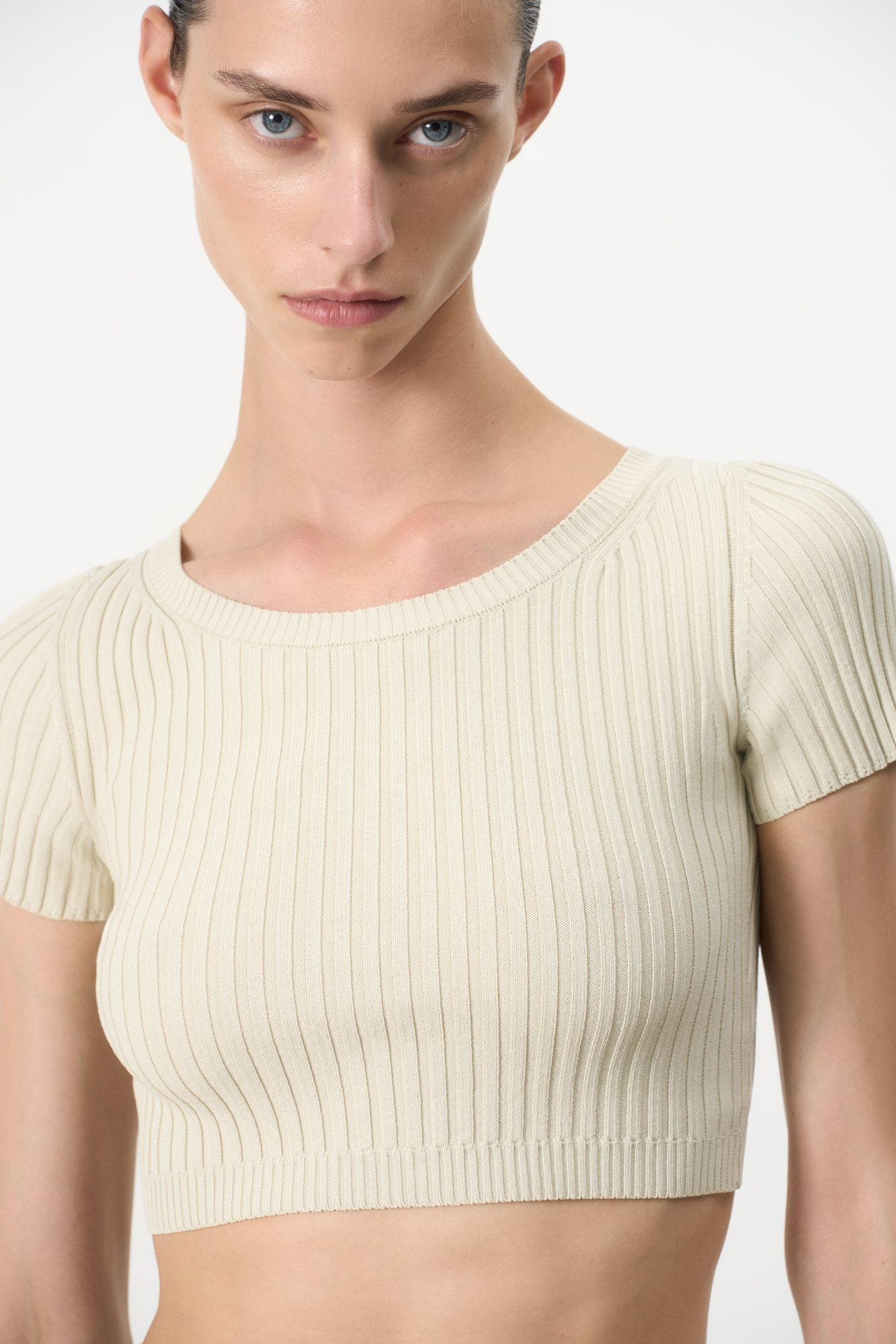 Короткий трикотажный топ из вискозы в рубчик. Модель приталенного силуэта с короткими рукавами и круглым вырезом горловины. Дополнить образ можно юбкой плиссе.