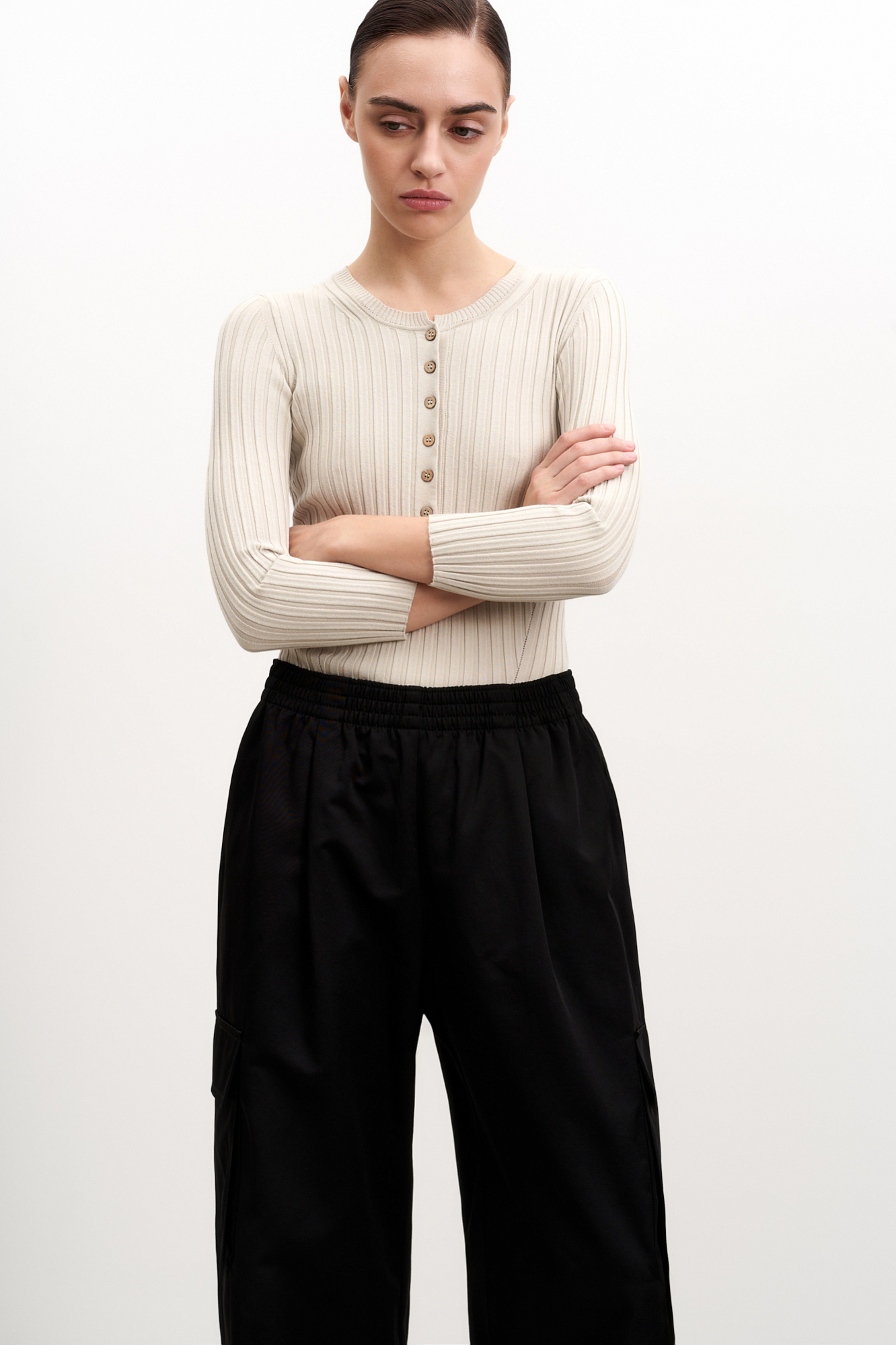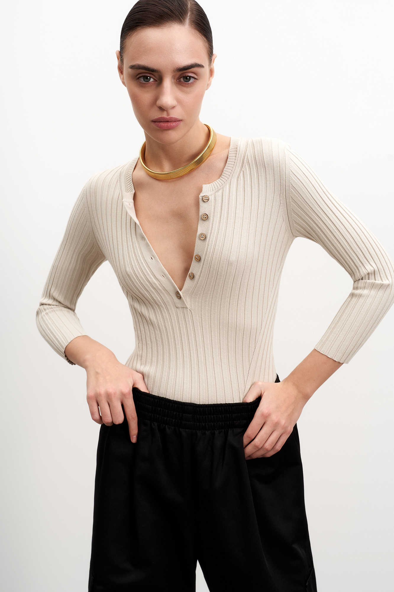 Трикотажный топ из вискозы в широкий рубчик. Модель с рукавами 3/4 и вырезом горловины с планкой на пуговицах, создающим V-образный вырез.