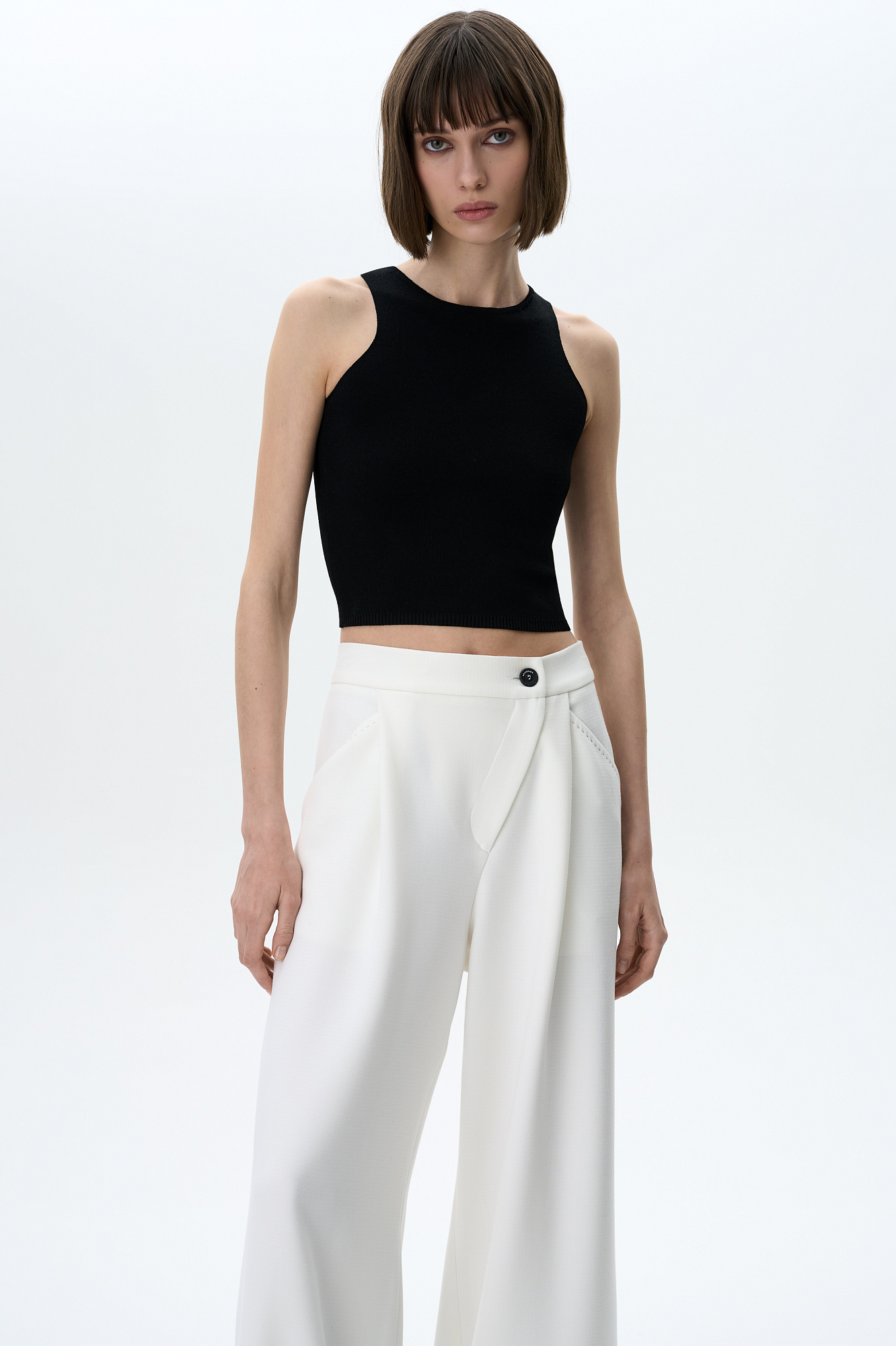 Трикотажный укороченный топ из вискозы. Модель без рукавов с круглым вырезом горловины.