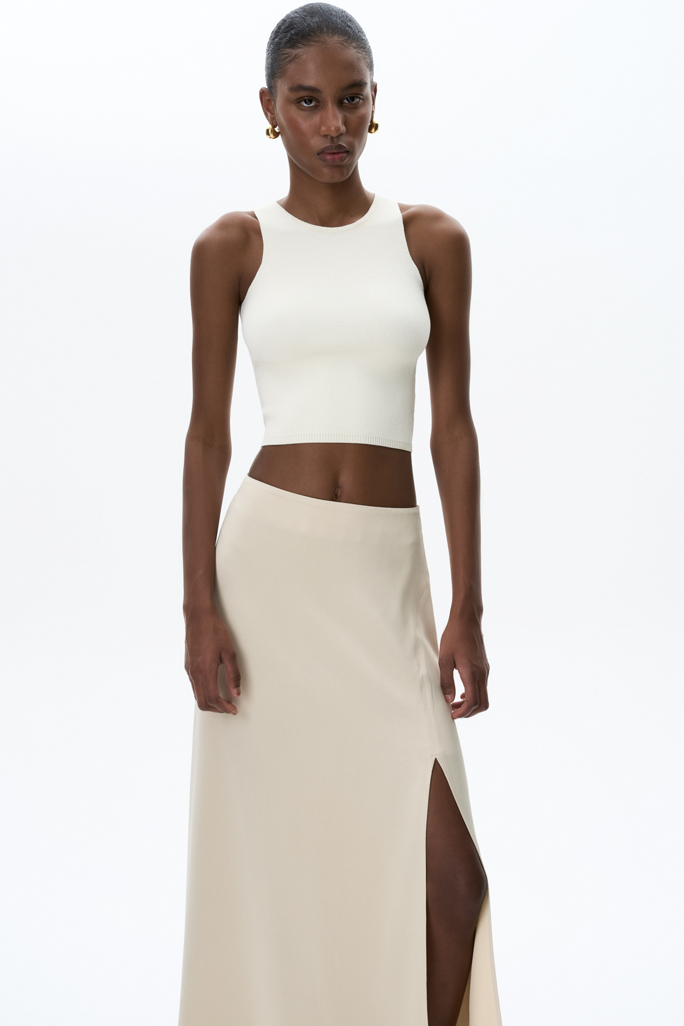 Трикотажный укороченный топ из вискозы. Модель без рукавов с круглым вырезом горловины.