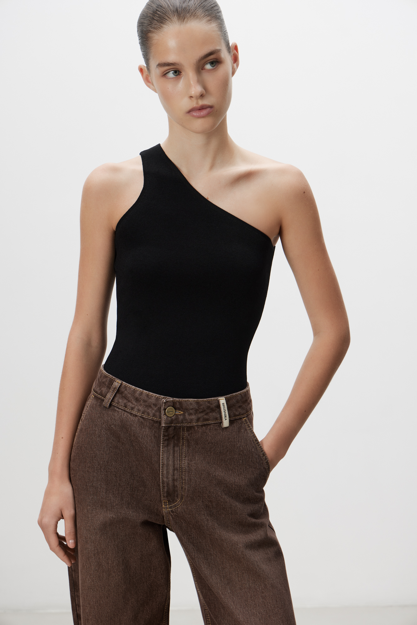 Трикотажный топ из вискозы. Модель облегающего силуэта, с лямкой на одно плечо.