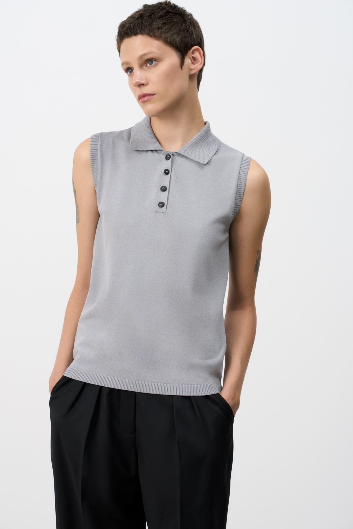 Трикотажный топ с воротником-поло. Модель приталенного силуэта, застежка на пуговицы. Края изделия в рубчик.