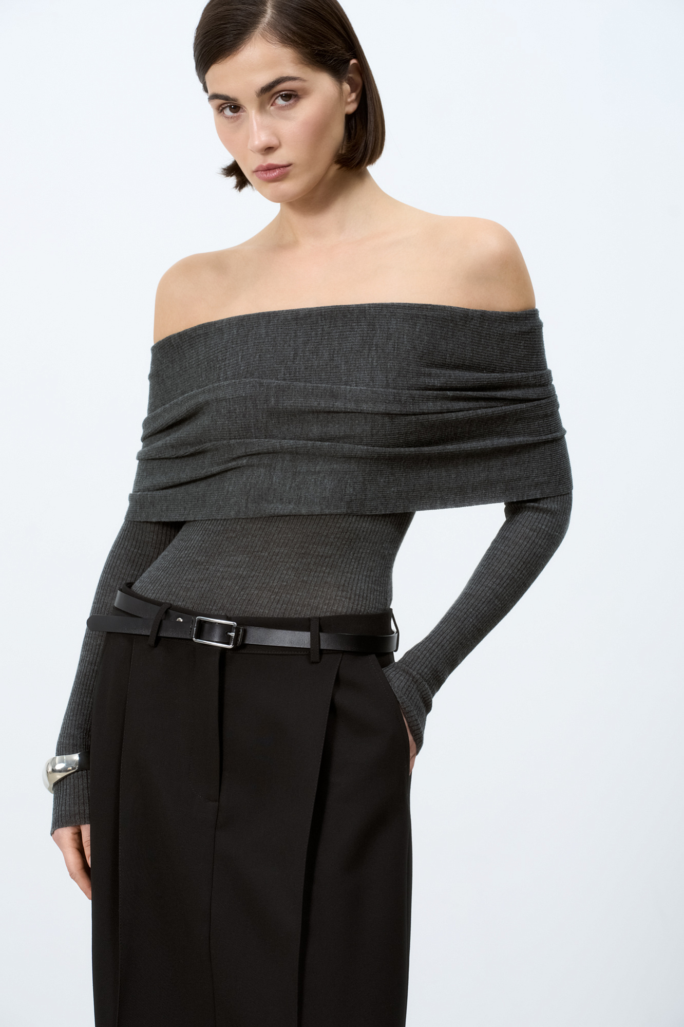 Трикотажный шерстяной топ с длинным рукавом и открытой линией плеч.