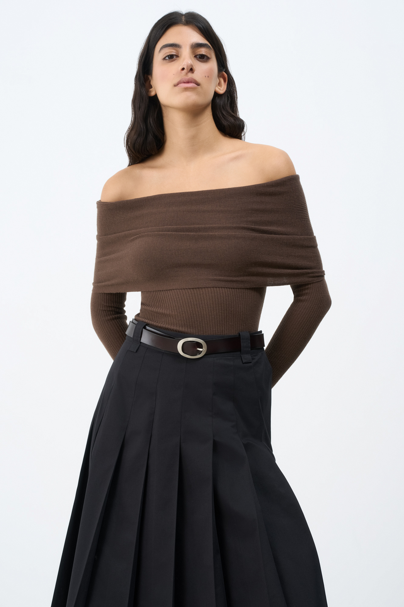 Трикотажный шерстяной топ с длинным рукавом и открытой линией плеч.