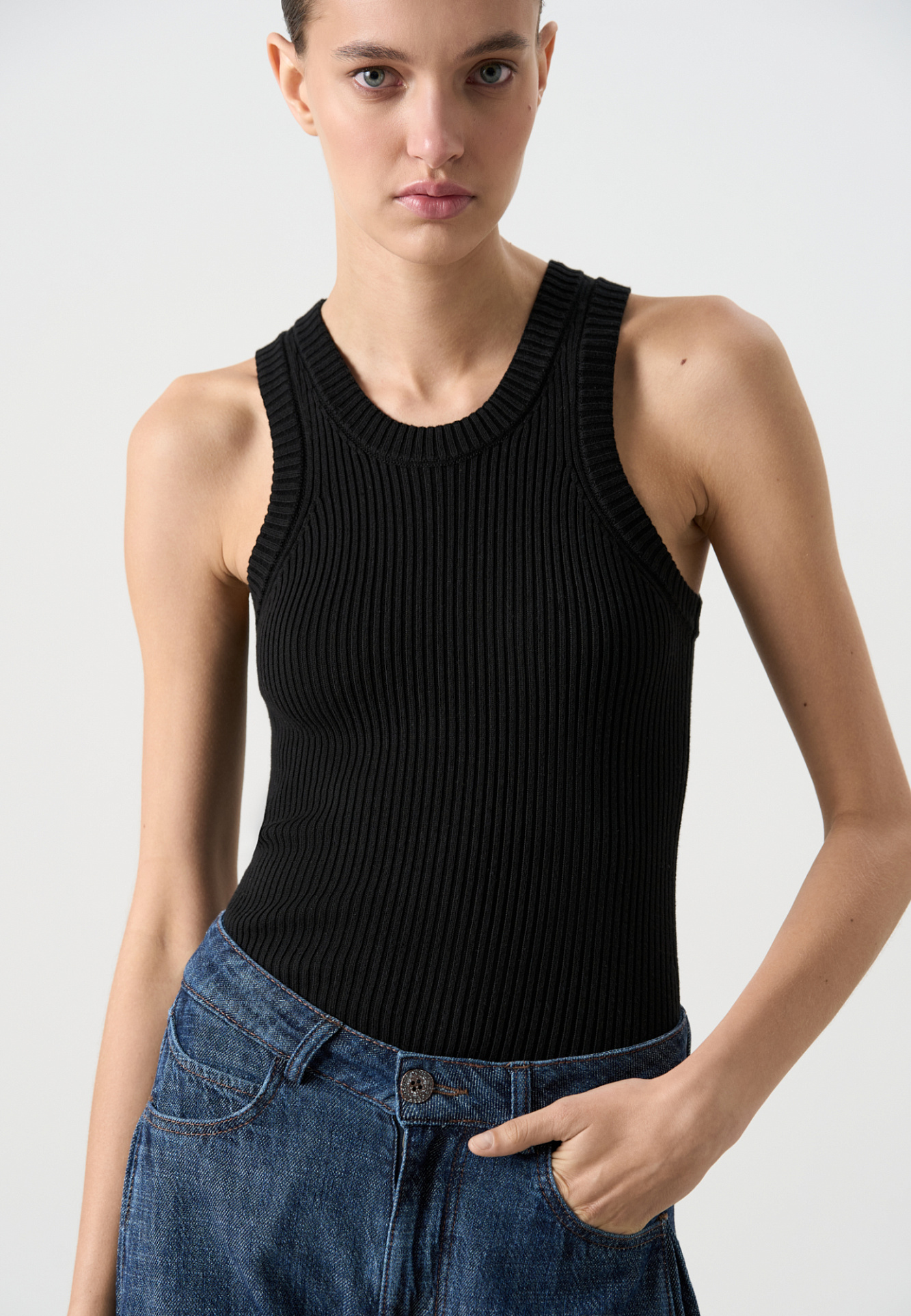 Трикотажный топ в широкий рубчик из хлопка с добавлением вискозы. Модель по фигуре, без рукавов, с глубокой проймой и U-вырезом горловины.