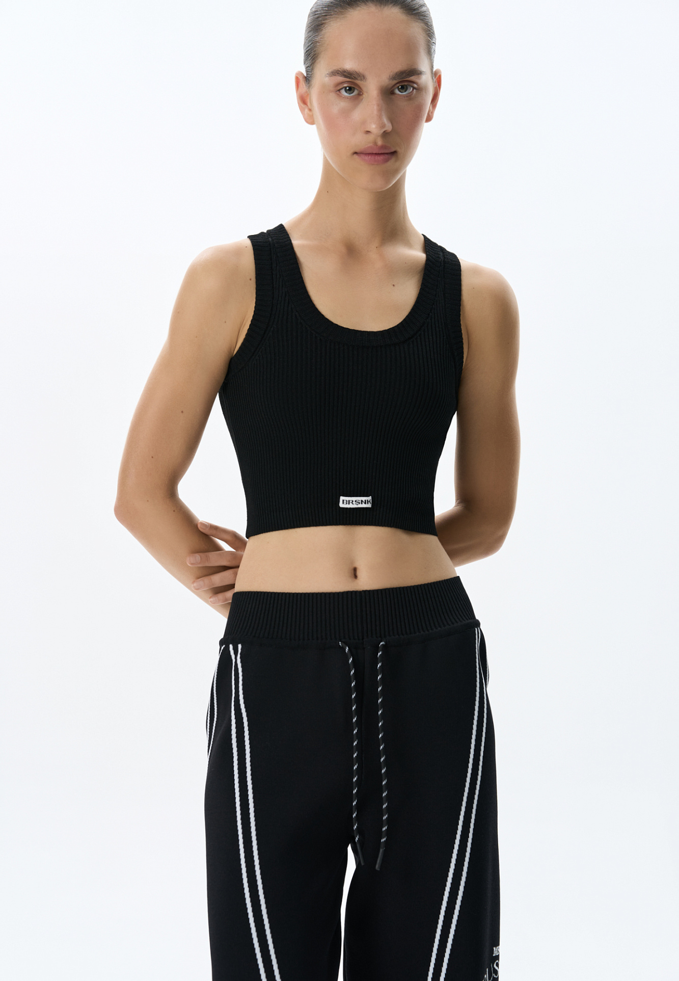 Трикотажный короткий топ из вискозы. Модель по фигуре, без рукавов и U-вырезом головины. Изделие выполнено в рубчик и декорирован брендированным жаккардом спереди.