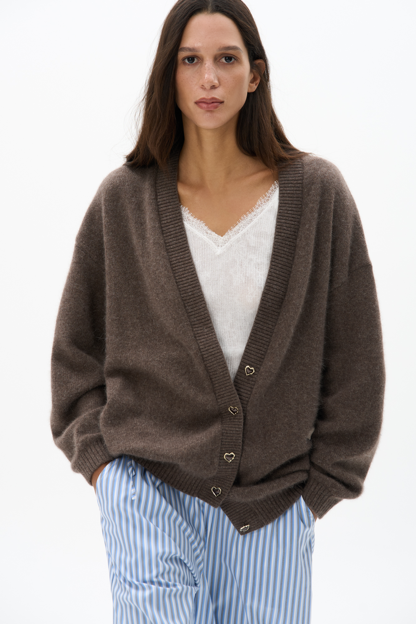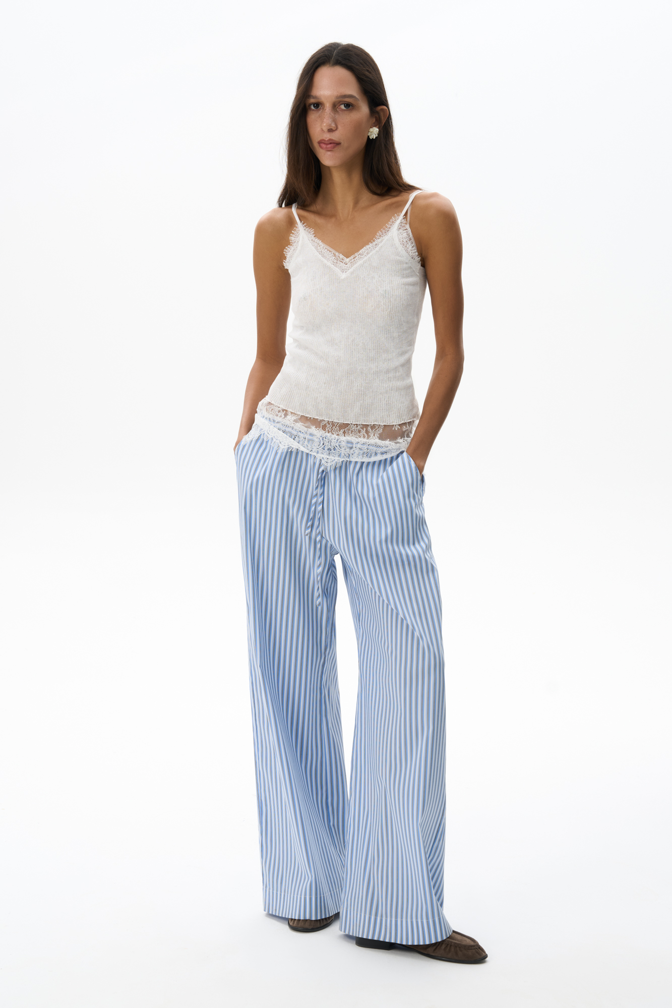 Трикотажный топ из тонкого хлопка. Модель в рубчик на тонких бретельках и глубоким вырезом декольте. Изделие декорировано кружевом.