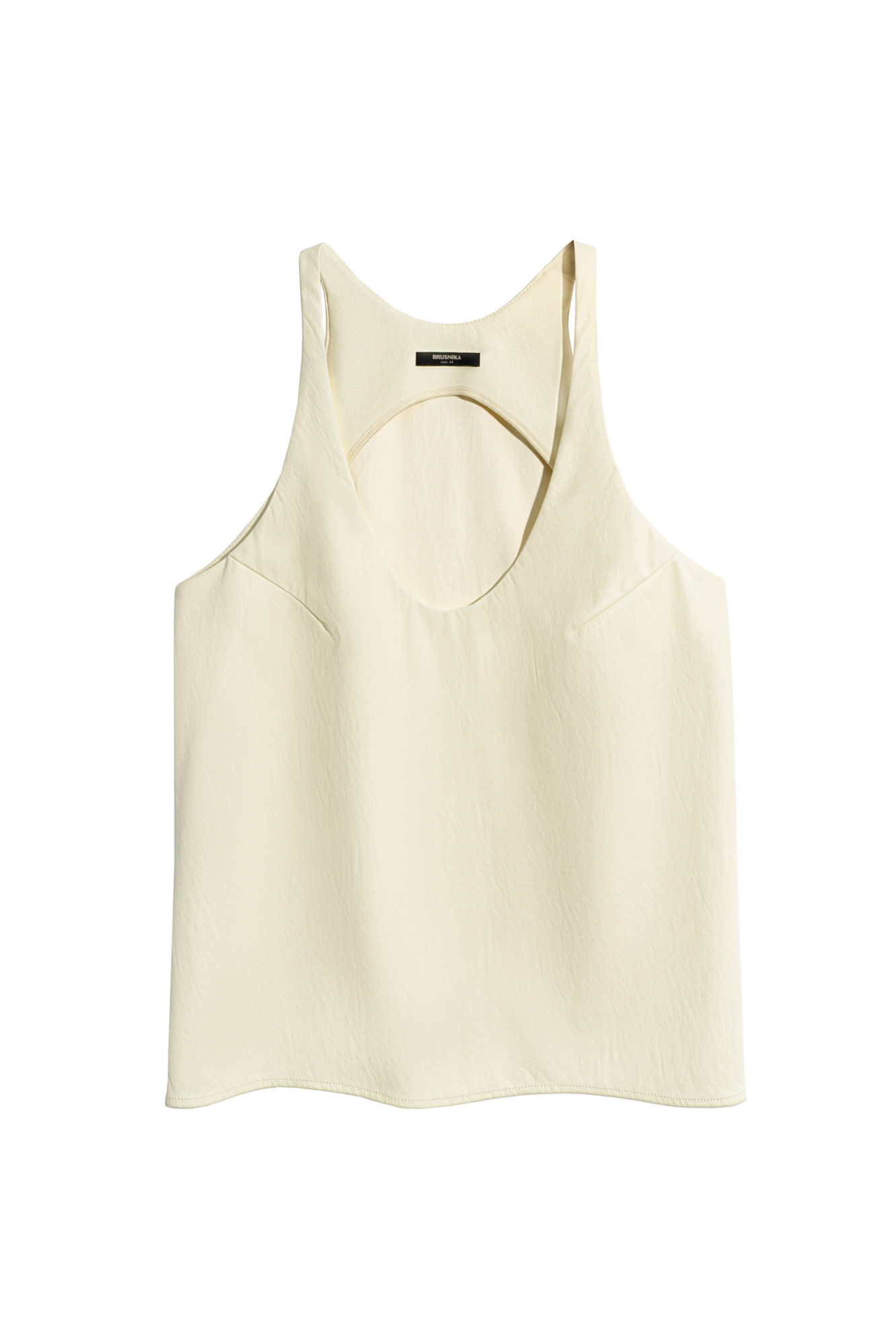Топ из текстурной экокожи. Модель свободного силуэта на тонких бретельках и глубоким вырезом декольте.
