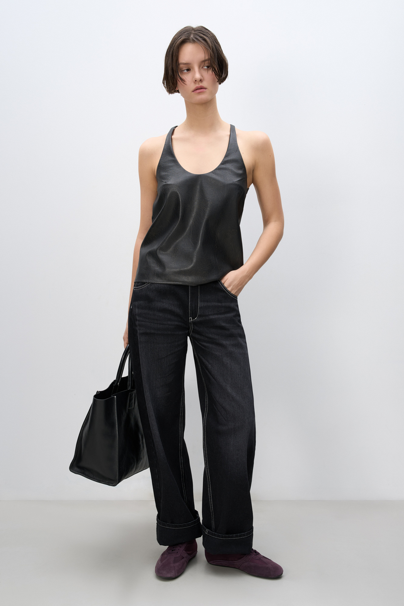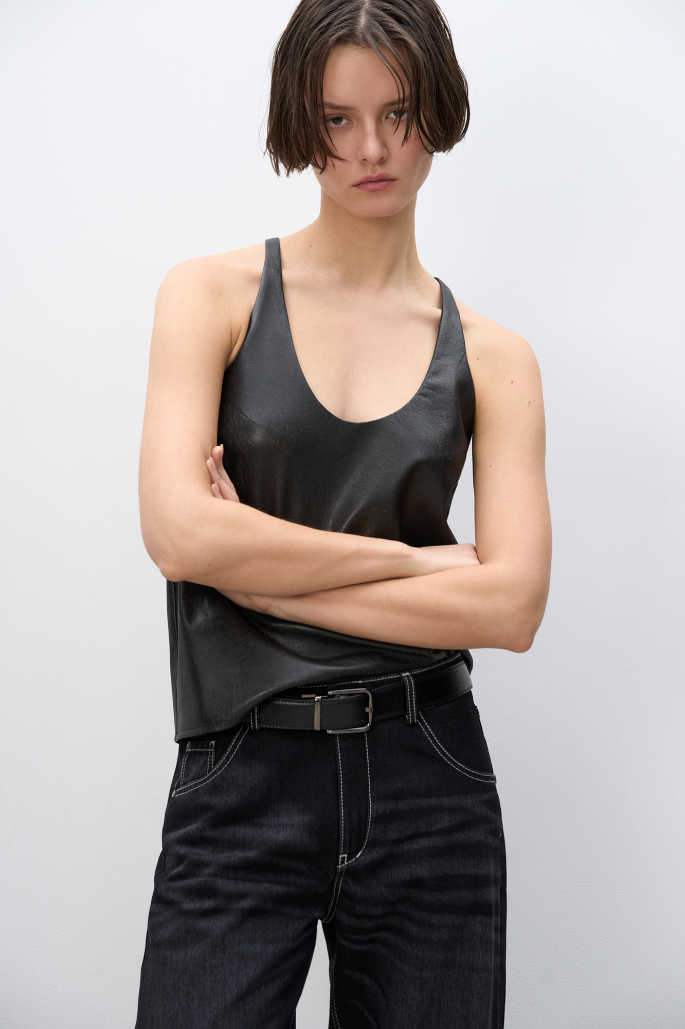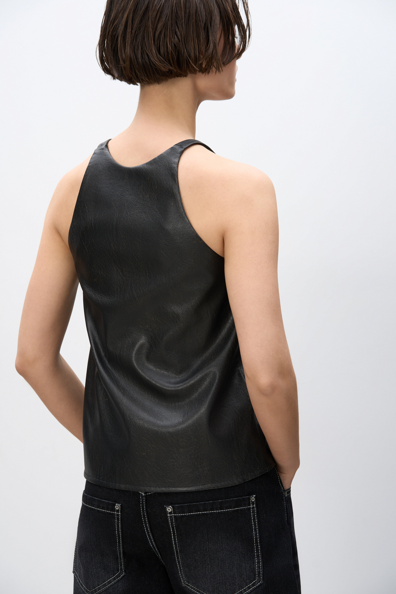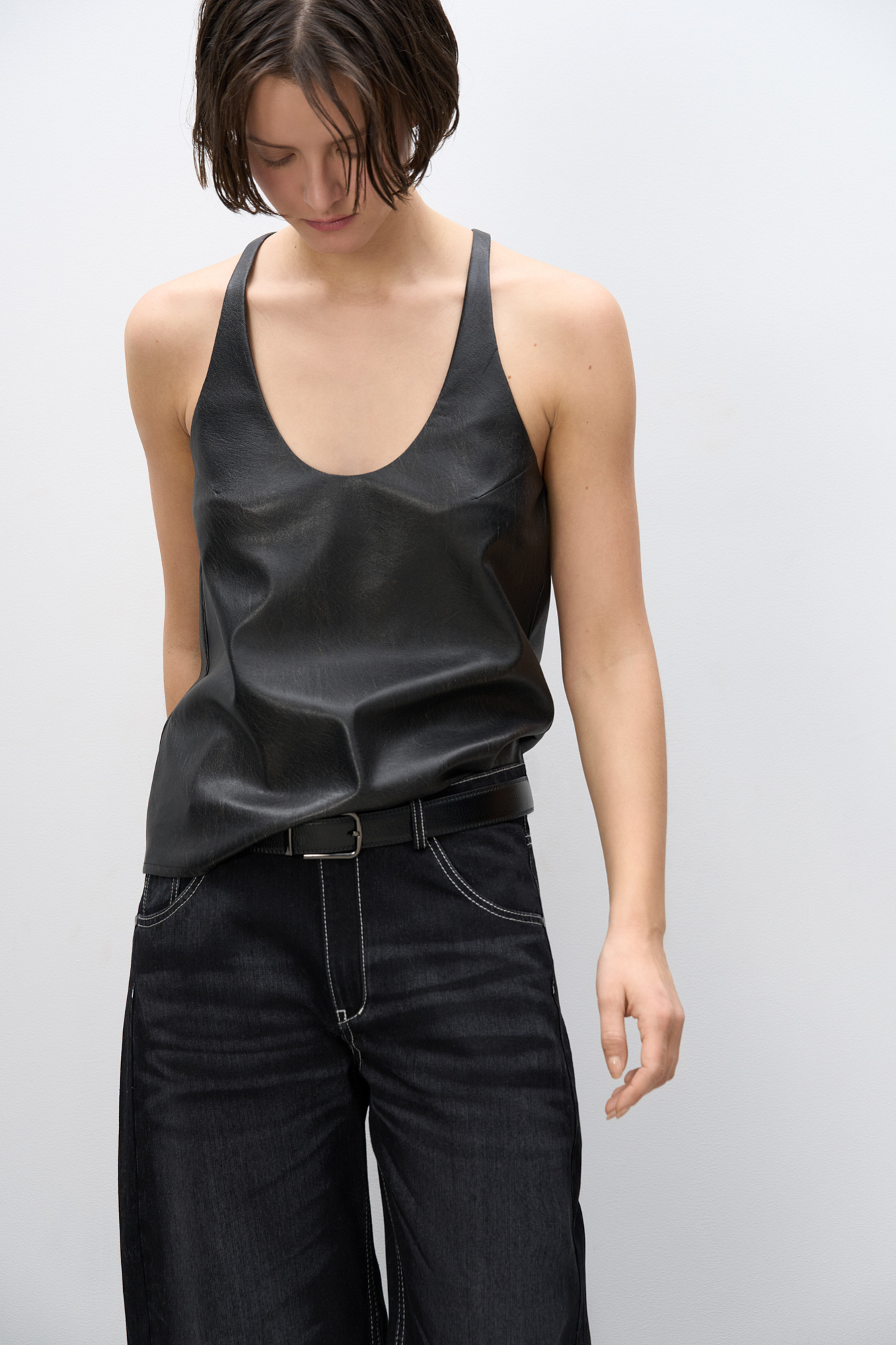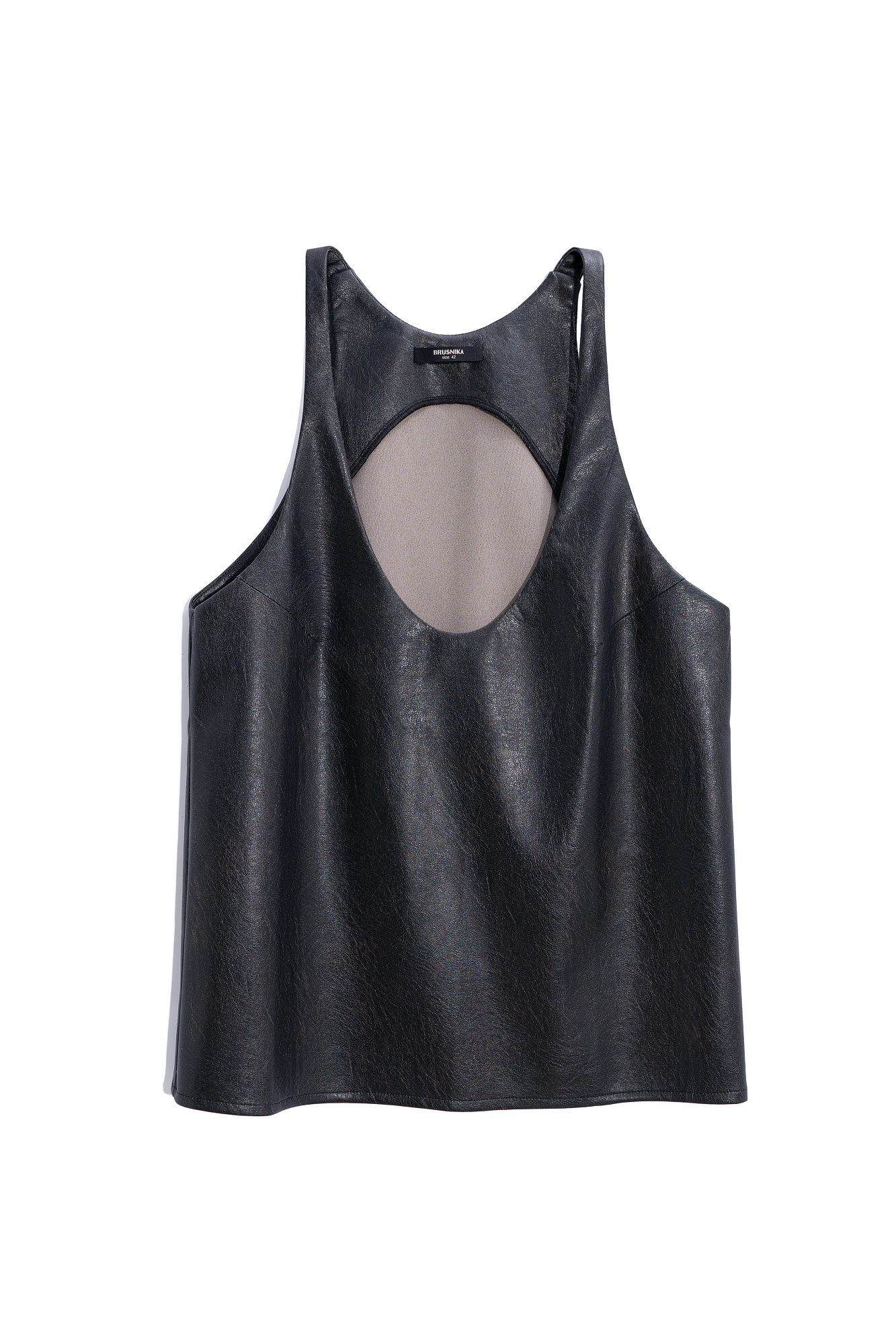 Топ из текстурной экокожи. Модель свободного силуэта на тонких бретельках и глубоким вырезом декольте.