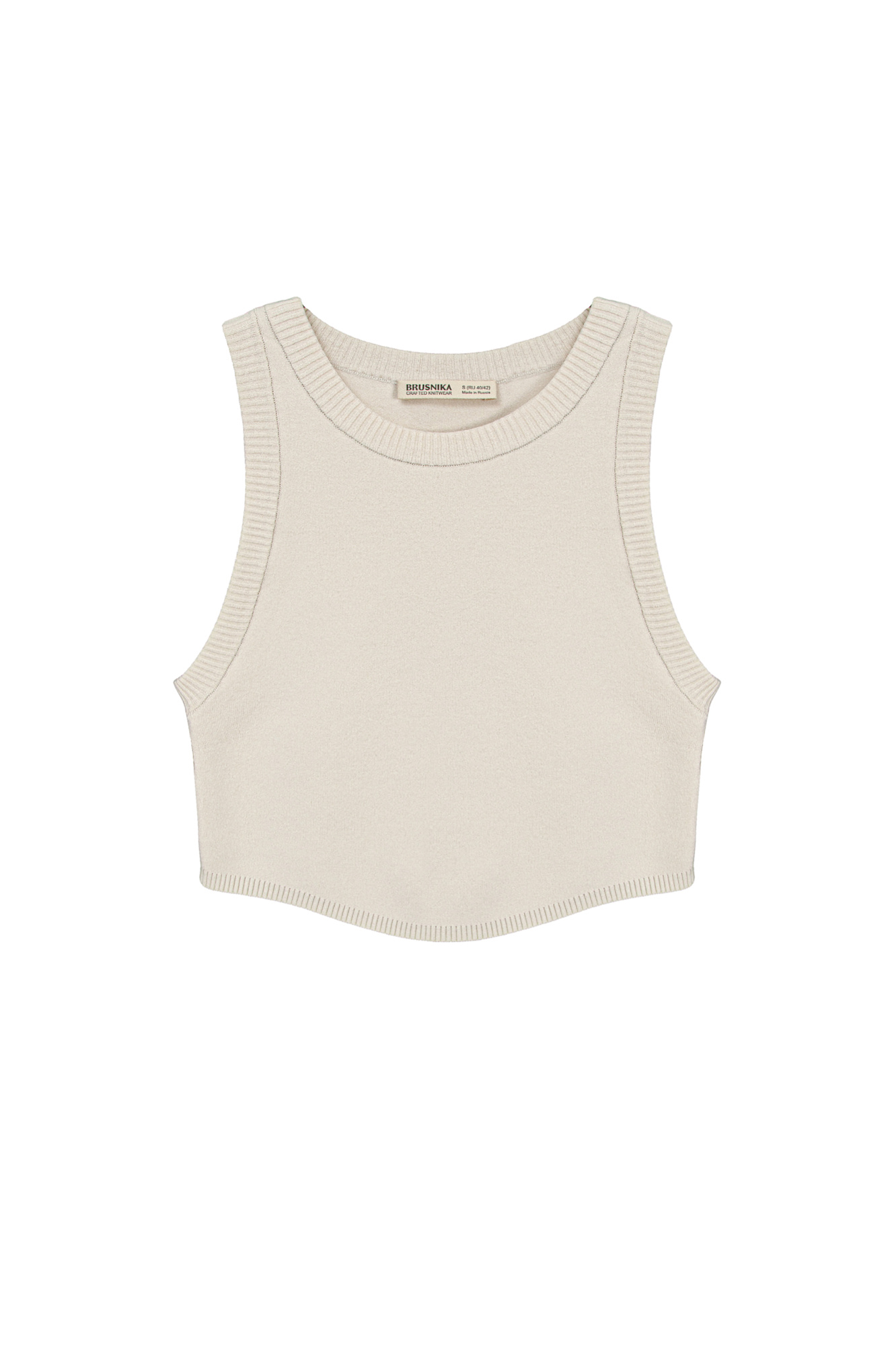 Трикотажный кроп-топ из поливискозы с круглым вырезом горловины и неровным низом. Края изделия выполнены в рубчик.