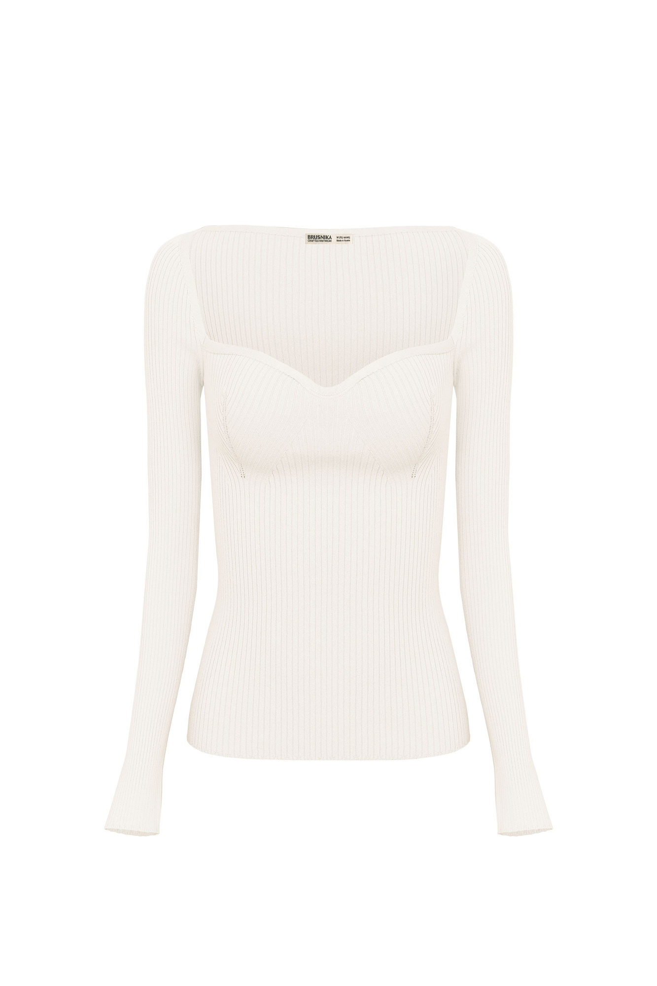 Трикотажный топ из вискозы. Модель приталенного силуэта с вывязанным открытым декольте, длинными рукавами и разрезом на манжетах.
