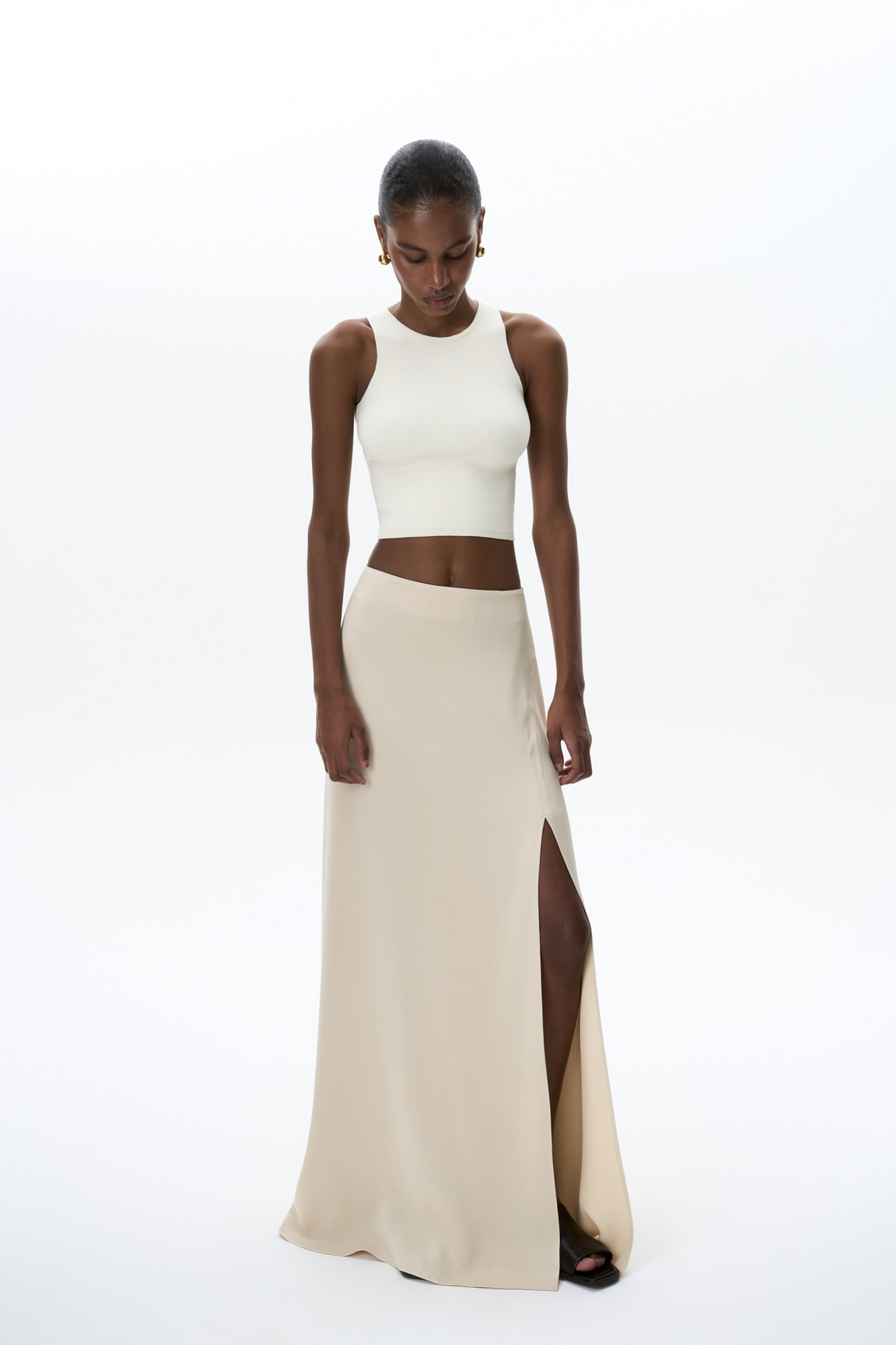 Трикотажный укороченный топ из вискозы. Модель без рукавов с круглым вырезом горловины.