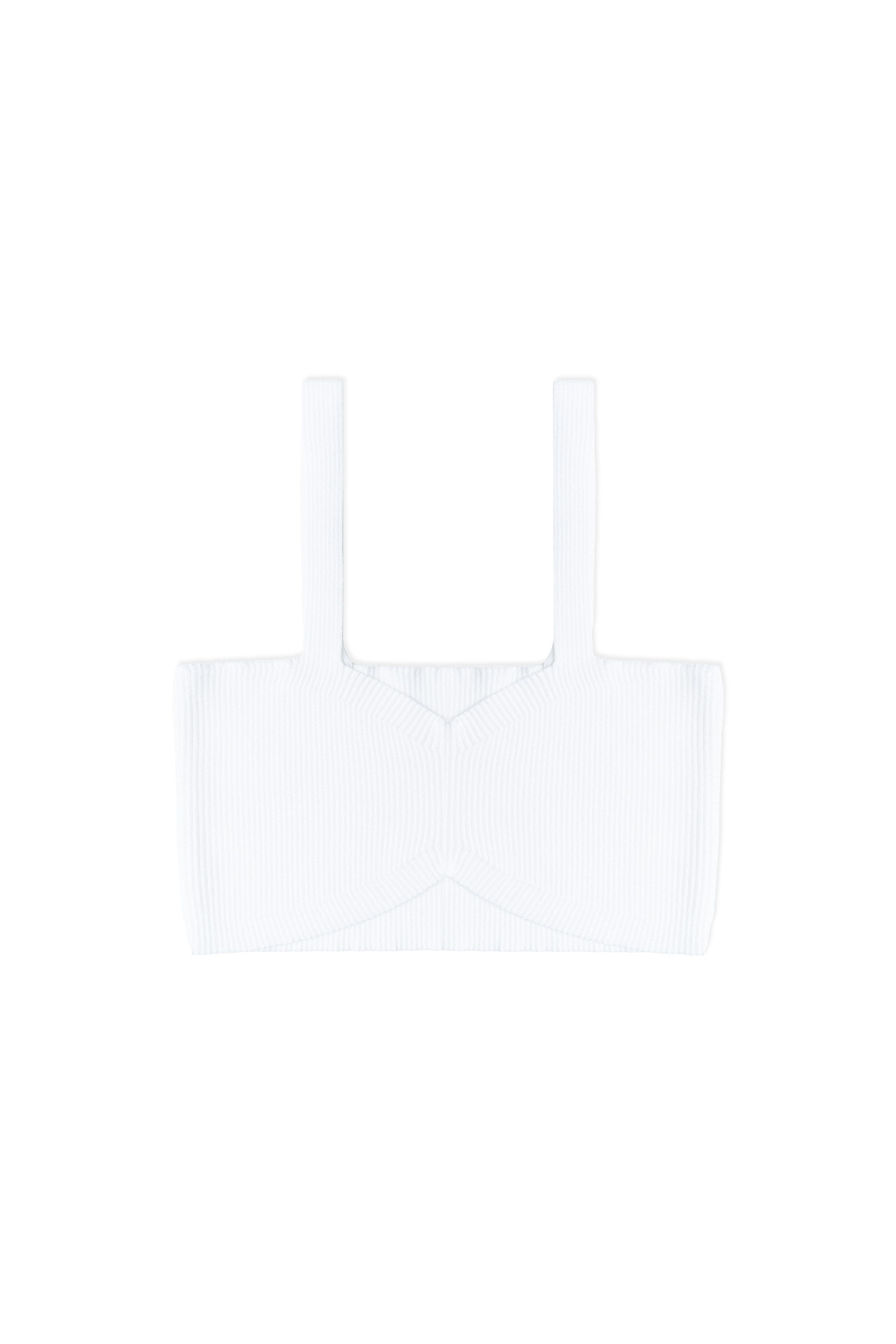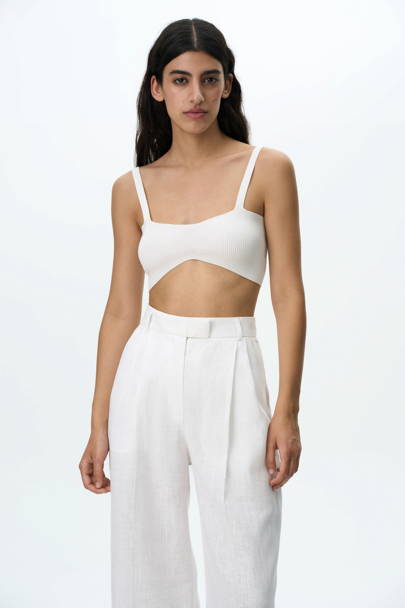 Трикотажный кроп-топ из вискозы. Модель на тонких бретелях. Изделие выполнено в рубчик.