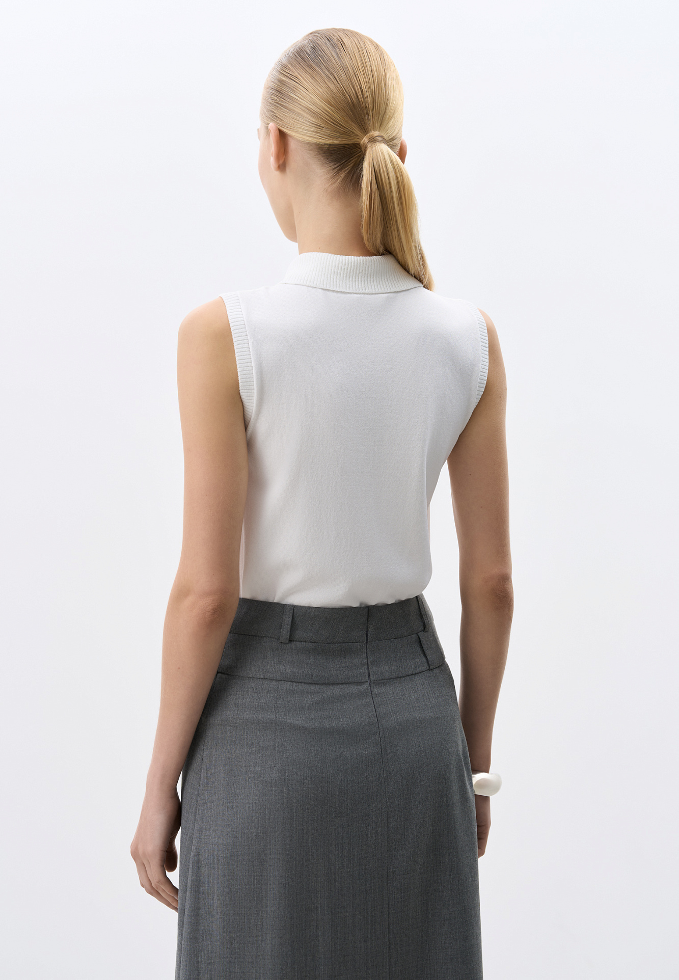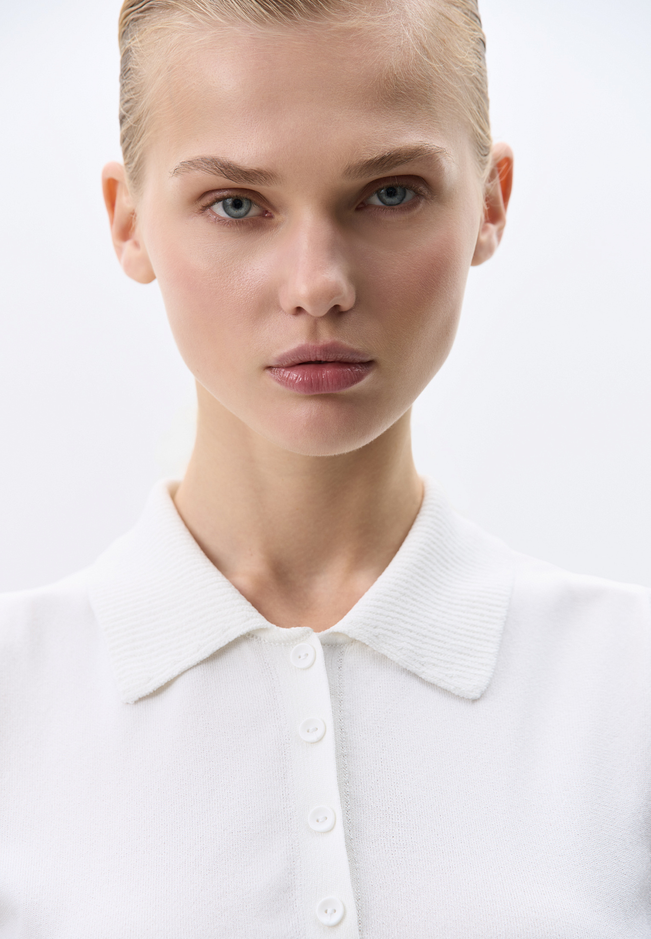 Трикотажный топ с воротником-поло. Модель приталенного силуэта, застежка на пуговицы. Края изделия в рубчик.