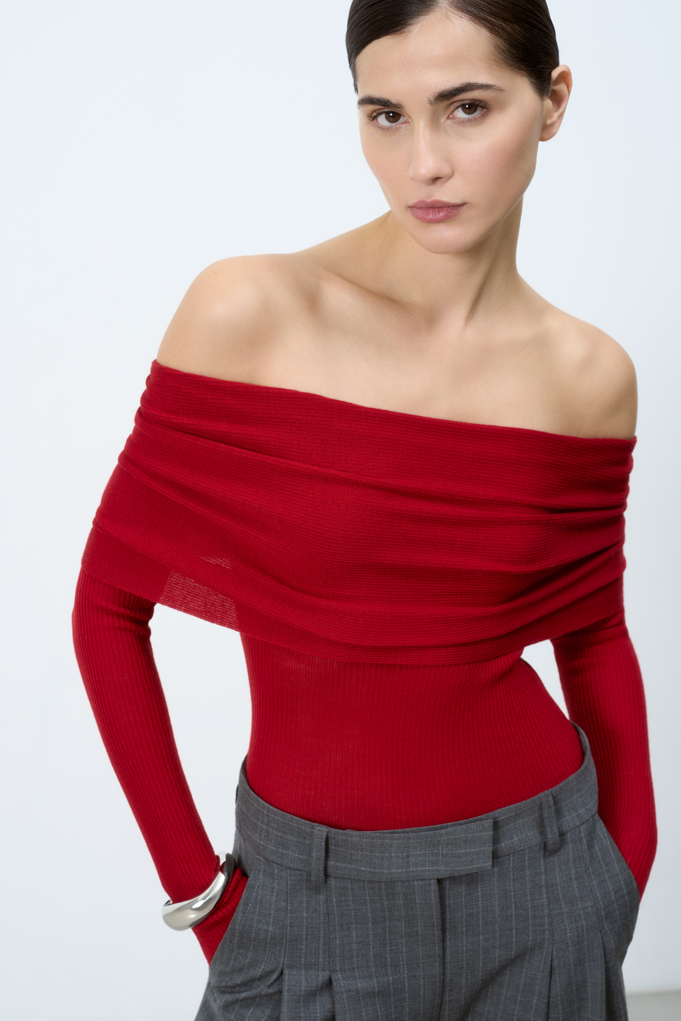 Трикотажный шерстяной топ с длинным рукавом и открытой линией плеч.