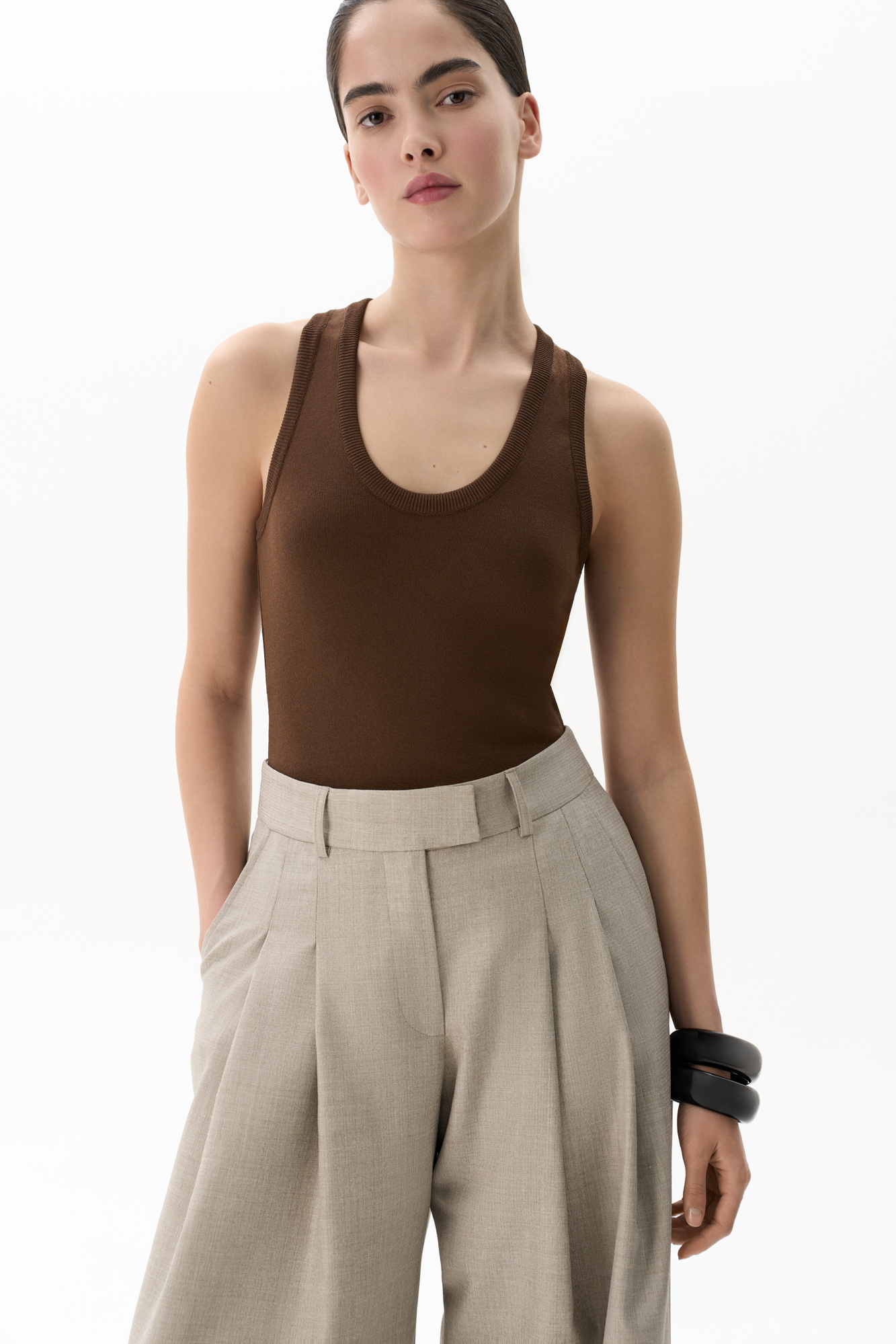 Трикотажный топ из вискозы. Модель приталенного силуэта, с U-образным вырезом горловины и глубокой проймой.