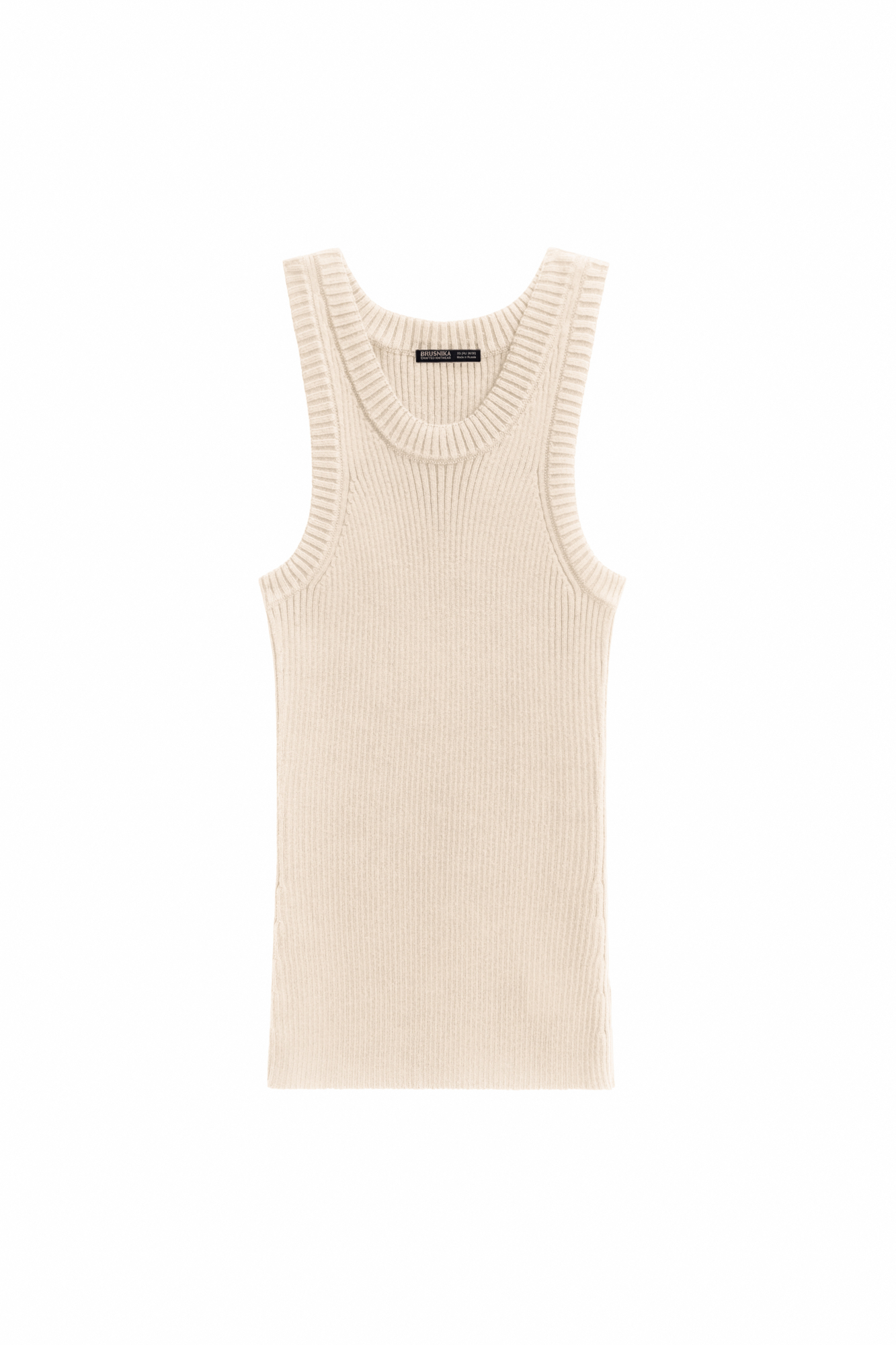 Трикотажный топ в широкий рубчик из хлопка с добавлением вискозы. Модель по фигуре, без рукавов, с глубокой проймой и U-вырезом горловины.