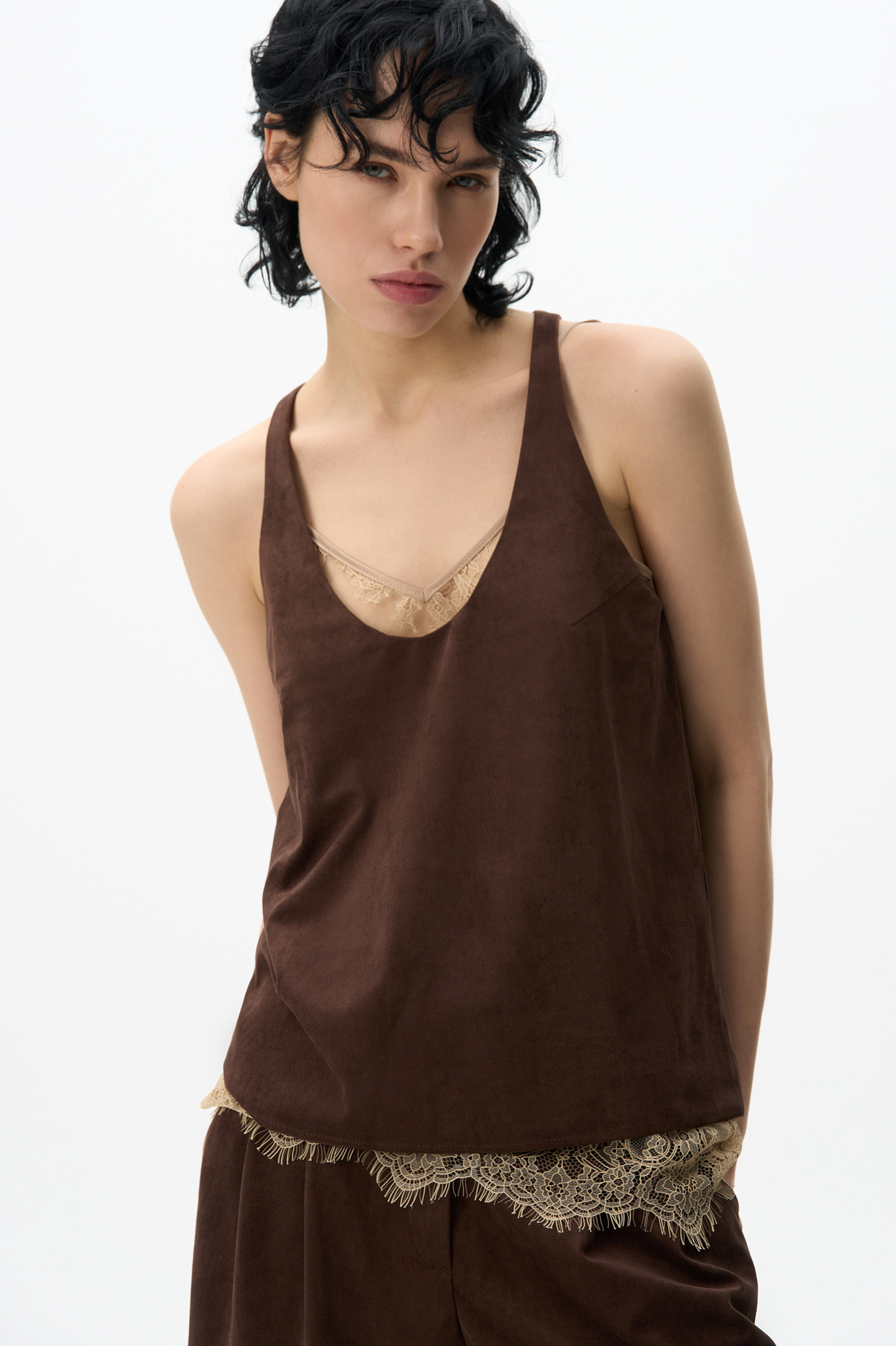 Топ из ткани с имитацией внешнего вида и свойств натуральной замши. Модель свободного силуэта на тонких бретельках и глубоким вырезом декольте.