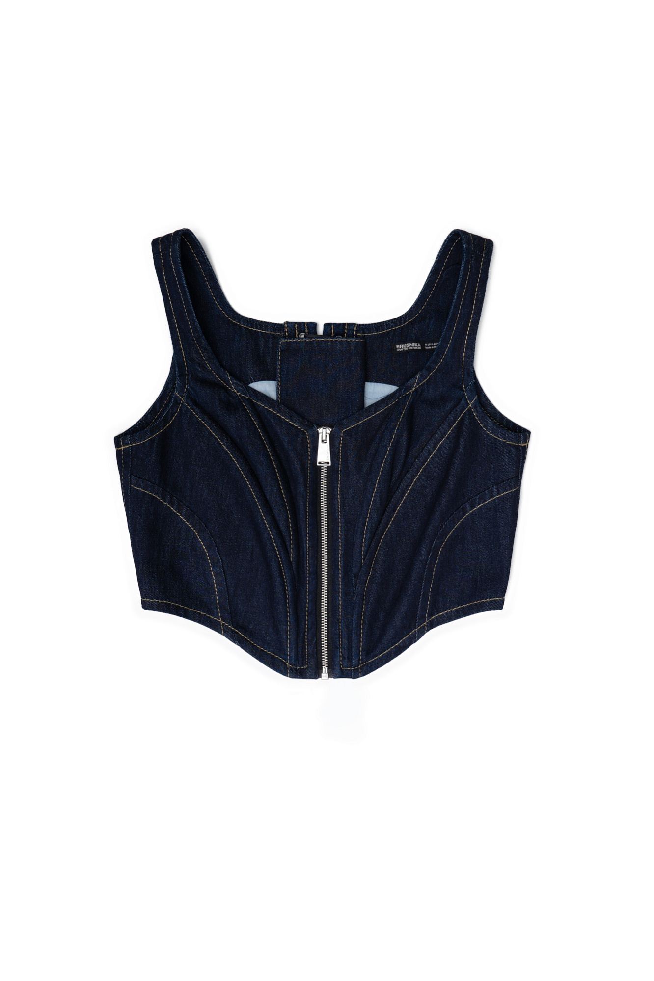 Джинсовый корсет из 100% хлопка с застежкой на молнии и лентой-завязкой на спинке. Дополнить образ можно джинсами и джинсовкой.