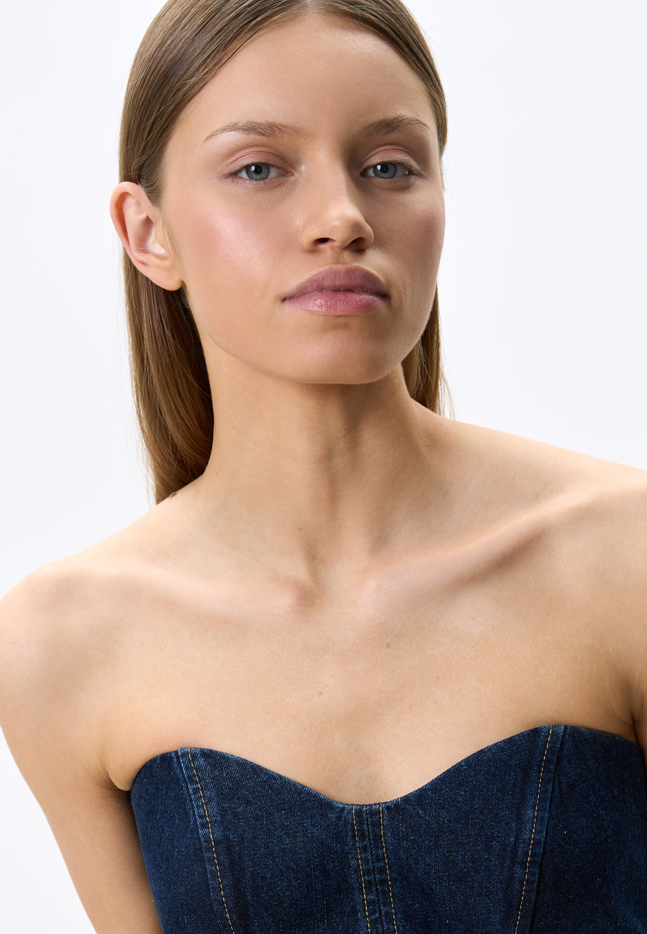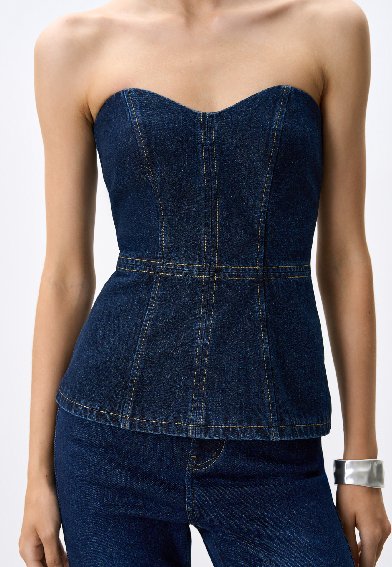 Джинсовый корсет из 100% хлопка. Модель имеет фактурный лиф и расклешеннный книзу силуэт. Изделие  декорировано строчкой контрастного цвета. Застежка на молнию сзади.