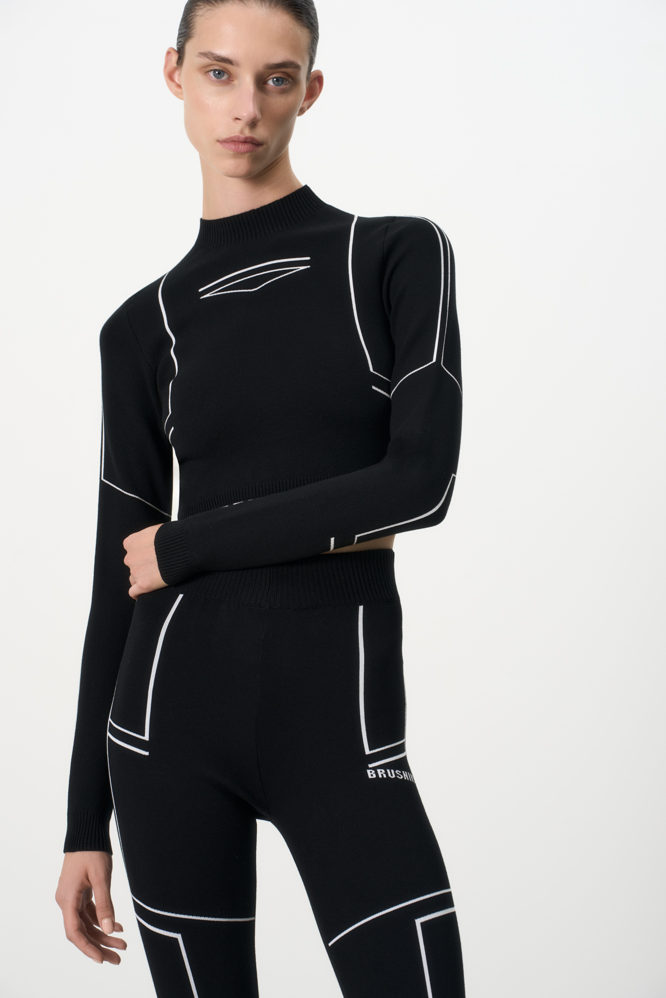 Трикотажный спортивныый топ из вискозы. Модель укороченного силуэта, с длинными рукавами и невысоким воротником стойкой. Края изделия выполнены в рубчик. Топ декорирован лампасами контрастного цвета.
