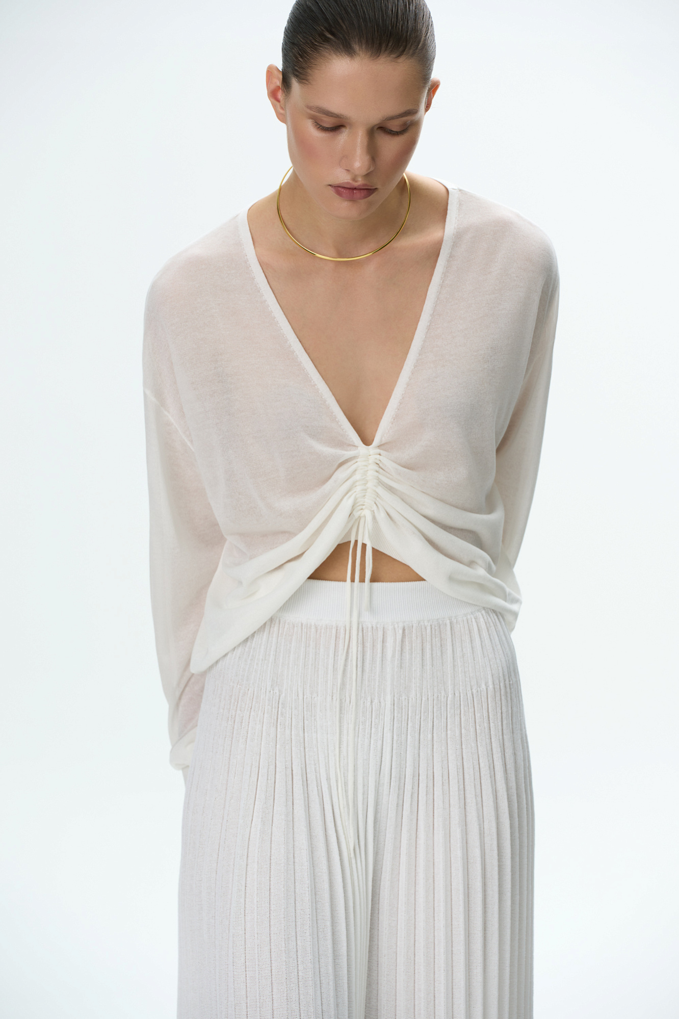 Полупрозрачный топ из тонкой вискозы. Модель свободного силуэта, с длинными рукавами и V-вырезом на кулиске.
