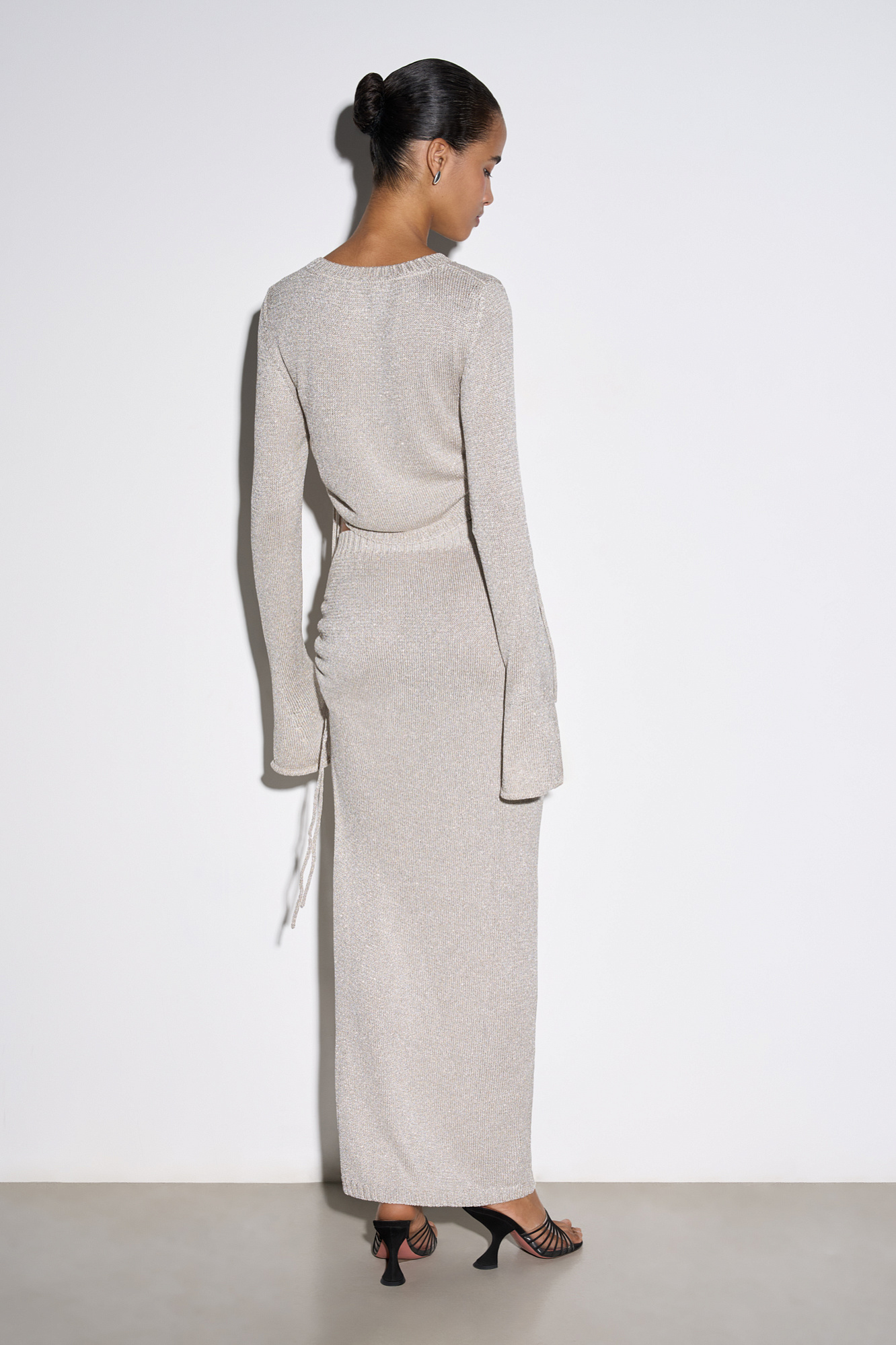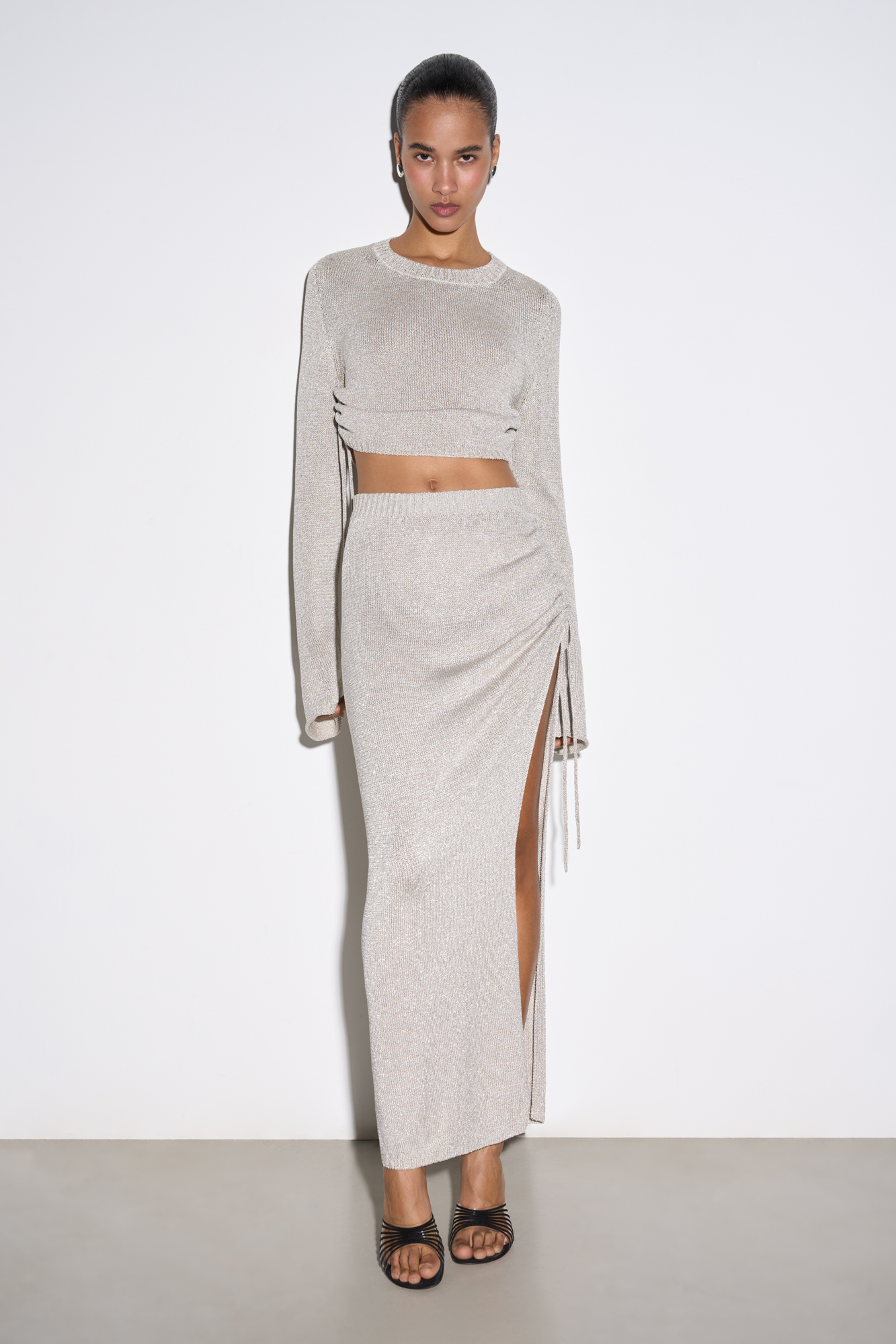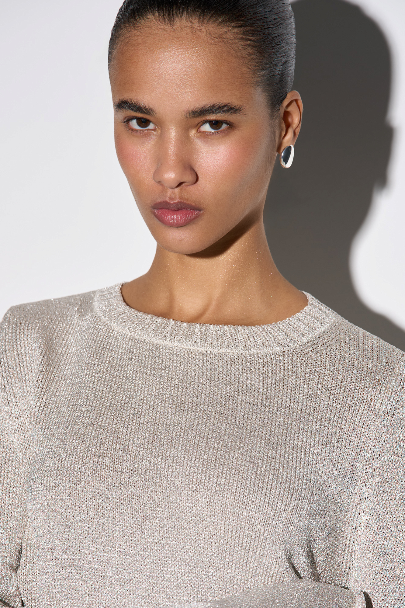 Трикотажный топ на кулиске с люрексом. Модель с длинными рукавами и круглым вырезом горловины. Изделие выполнено из материала с эффектом металлического блеска. Дополнить образ можно юбкой в таком же стиле.