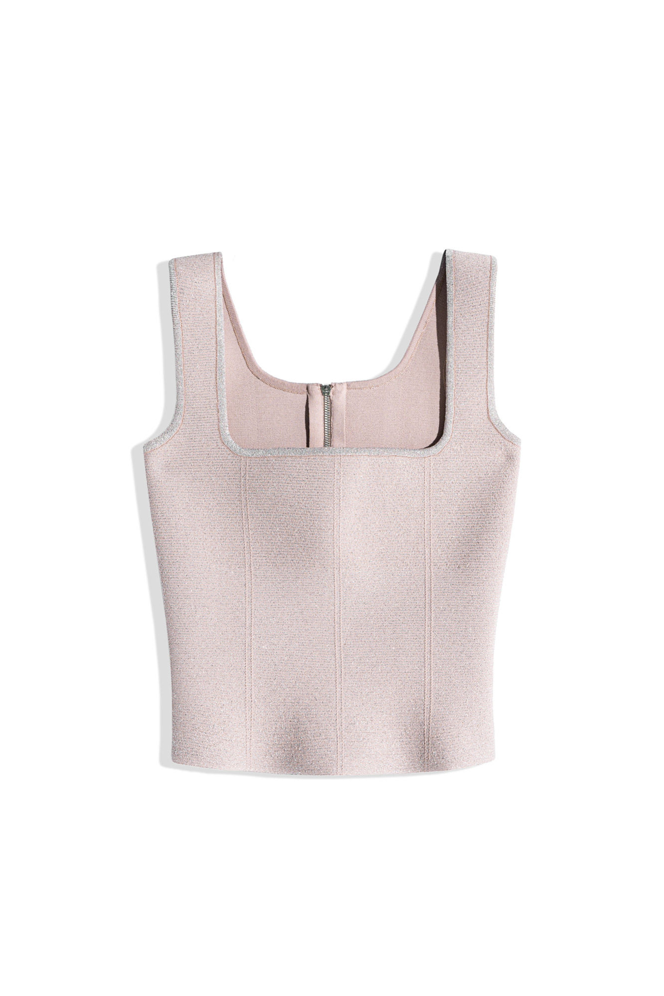 Короткий трикотажный корсет из вискозы с добавлением люрекса. Модель приталенного силуэта, с квадратным вырезом и широкими бретелями. Застежка на молнию сзади.