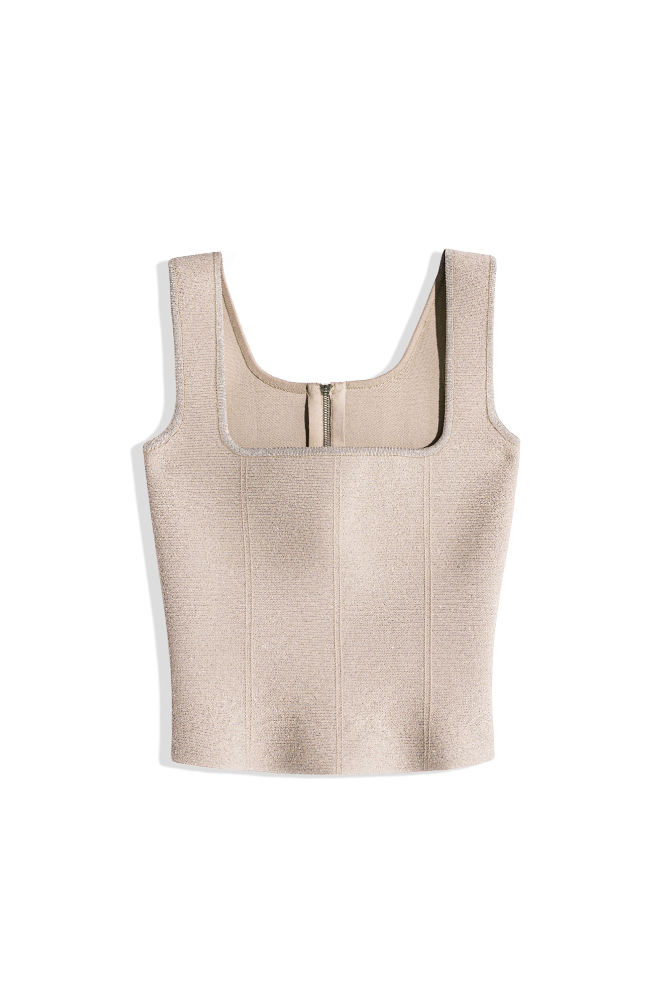 Короткий трикотажный корсет из вискозы с добавлением люрекса. Модель приталенного силуэта, с квадратным вырезом и широкими бретелями. Застежка на молнию сзади.
