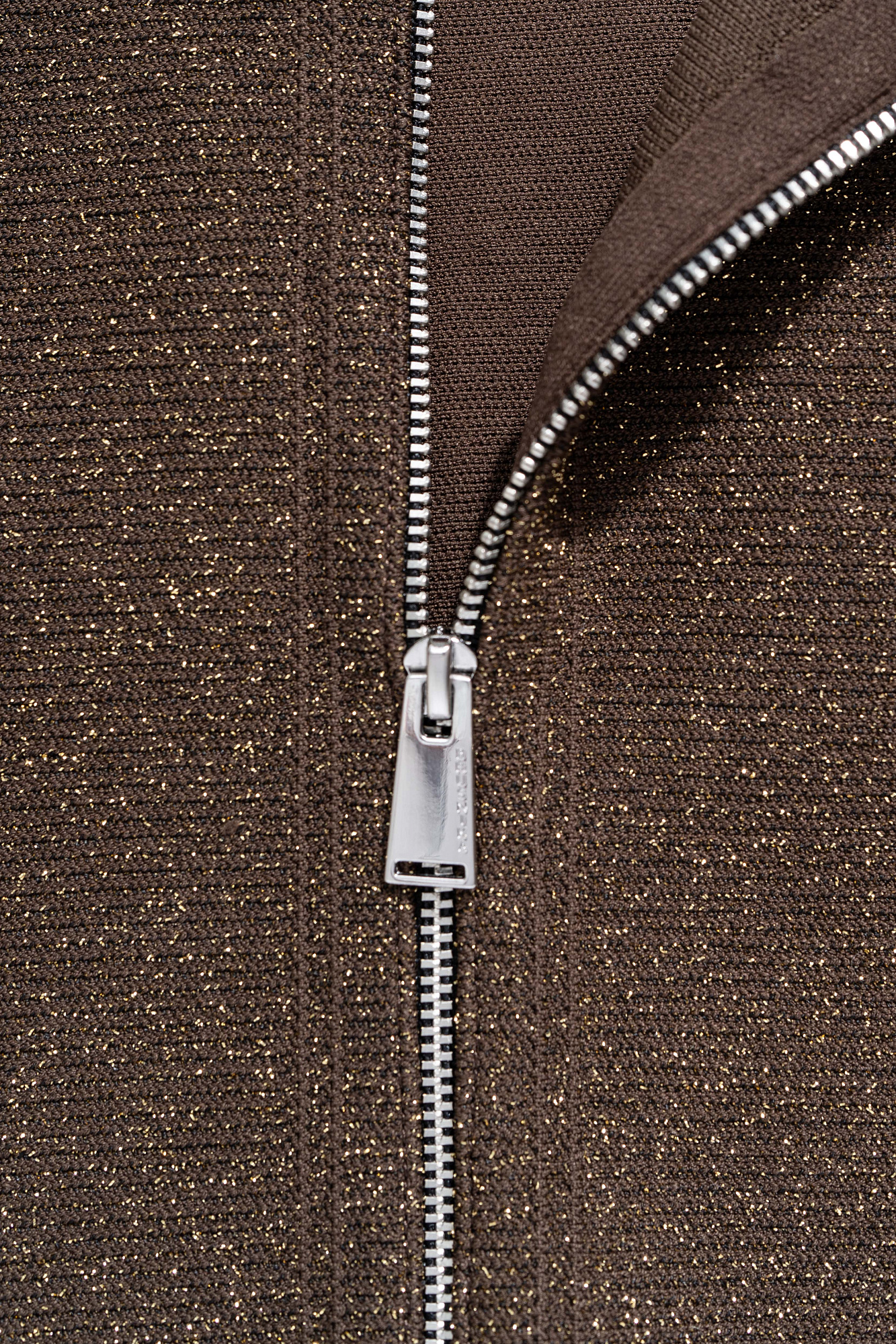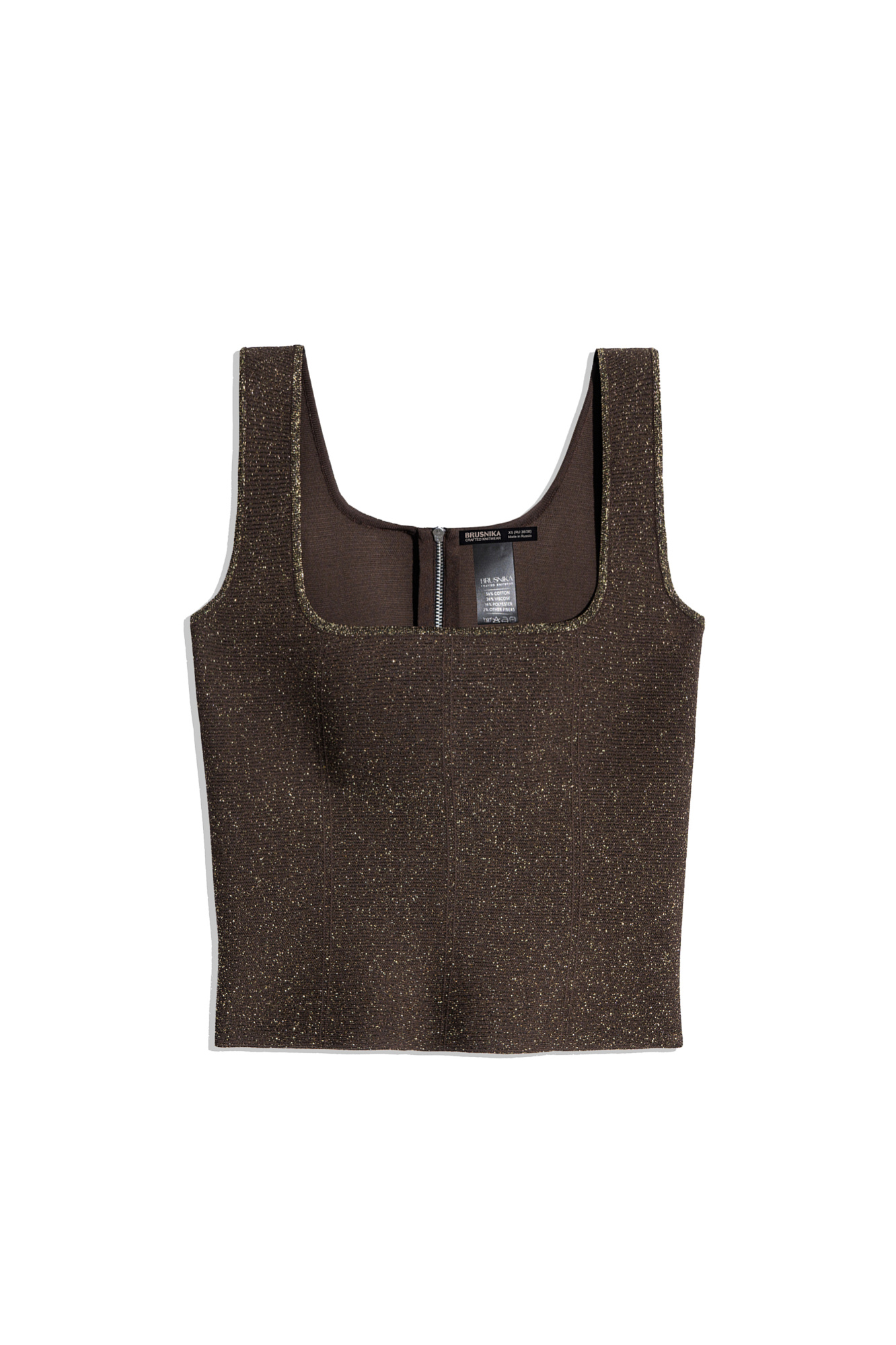 Короткий трикотажный корсет из вискозы с добавлением люрекса. Модель приталенного силуэта, с квадратным вырезом и широкими бретелями. Застежка на молнию сзади.