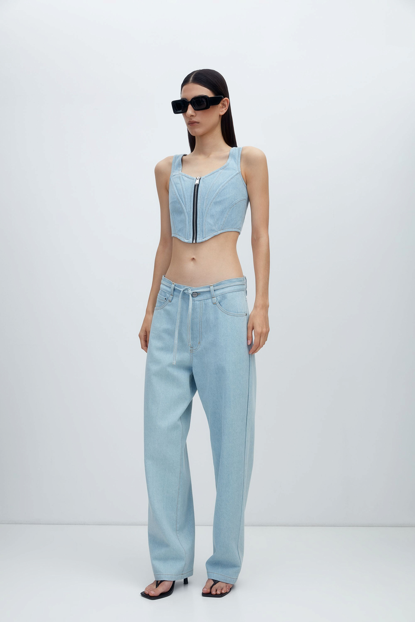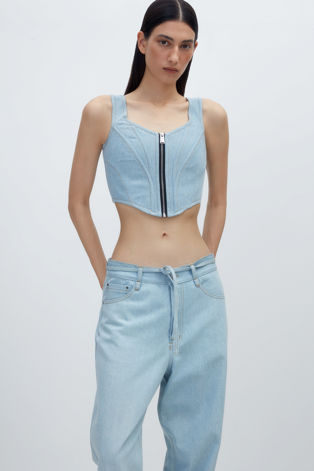 Джинсовый корсет из 100% хлопка с застежкой на молнии и лентой-завязкой на спинке. Дополнить образ можно джинсами и джинсовкой.