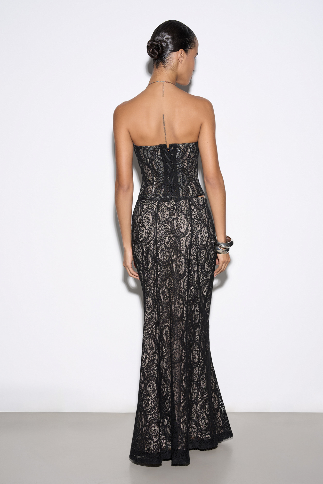 Корсет из тонкого кружева на контрастной подкладке с чашечками и шнуровкой по спинке. Дополнить образ можно юбкой в таком же стиле.