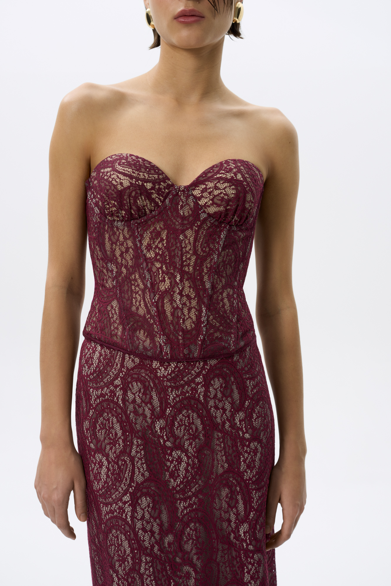 Корсет из тонкого кружева на контрастной подкладке с чашечками и шнуровкой по спинке. Дополнить образ можно юбкой в таком же стиле.