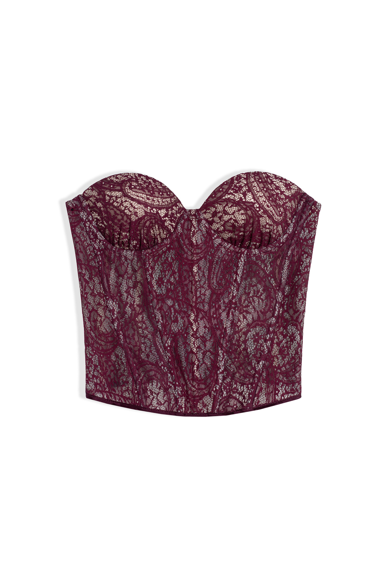 Корсет из тонкого кружева на контрастной подкладке с чашечками и шнуровкой по спинке. Дополнить образ можно юбкой в таком же стиле