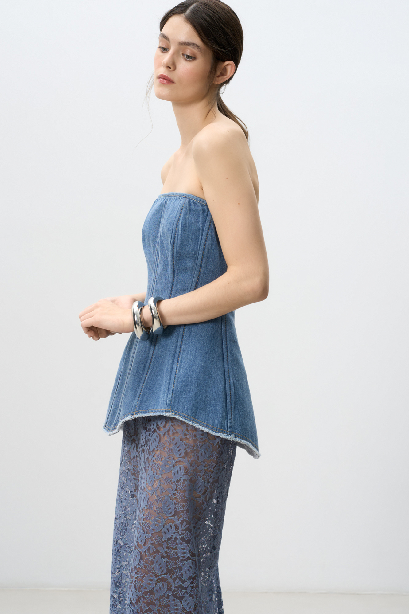 Джинсовый корсет из 100% хлопка. Модель с асимметричным низом, рельефными швами, контрастной стройчкой и застежкой на молнию на спине. Изделие на подкладке.