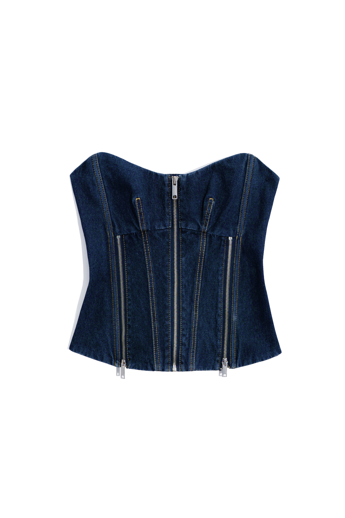Джинсовый корсет из 100% хлопка. Модель приталенного силуэта с акцентной строчкой и застежкой на молнию спереди. Шнуровка на спинке.