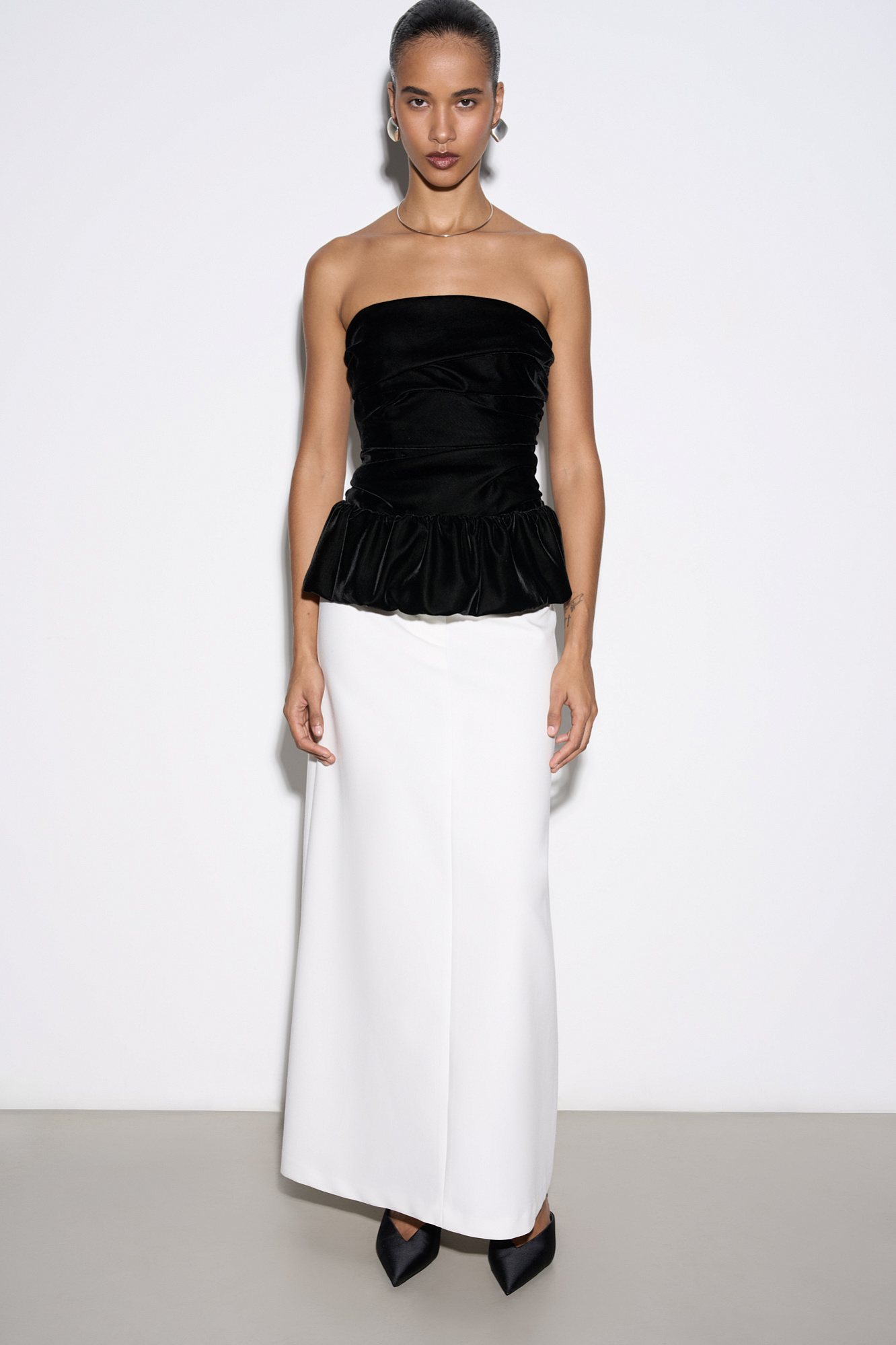 Бархатный корсет, декорированный драпировкой и баской. Модель приталенного силуэта с застежкой на молнию сзади. Изделие выполнено на подкладке.