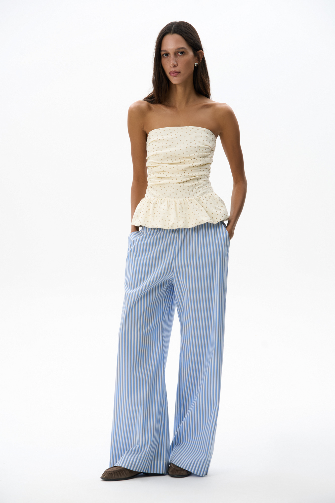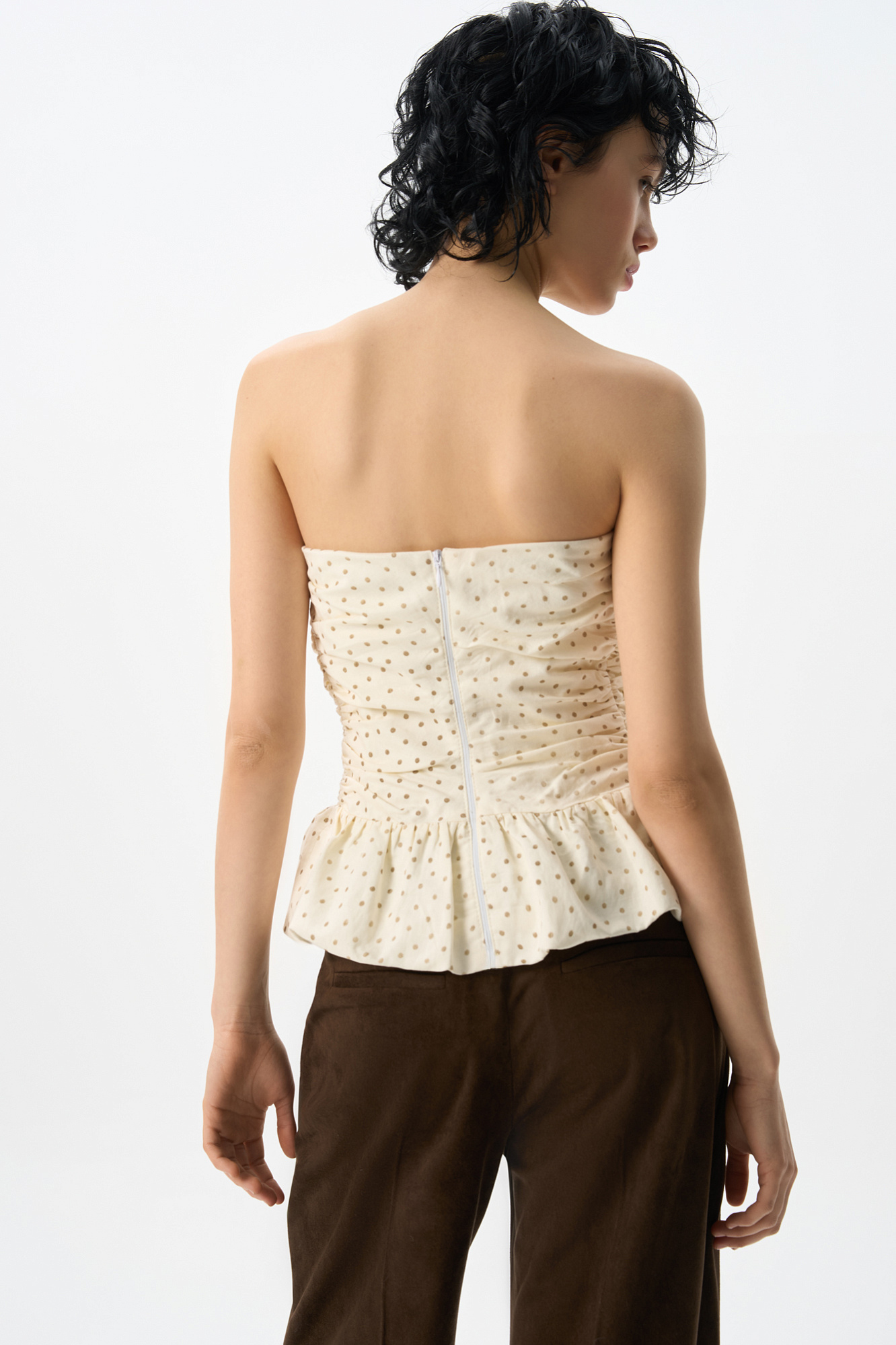 Корсет в горошек с баской и драпировкой. Модель приталенного силуэта, без бретелей. Застежка на потайную молнию.