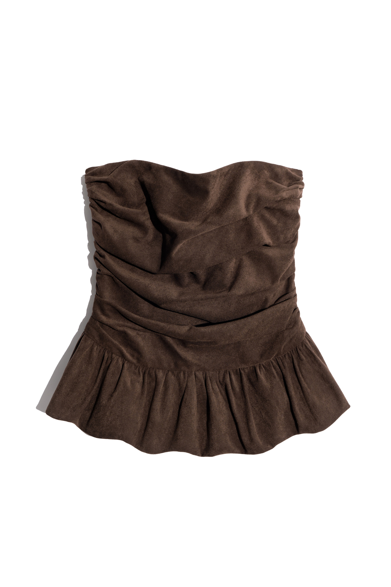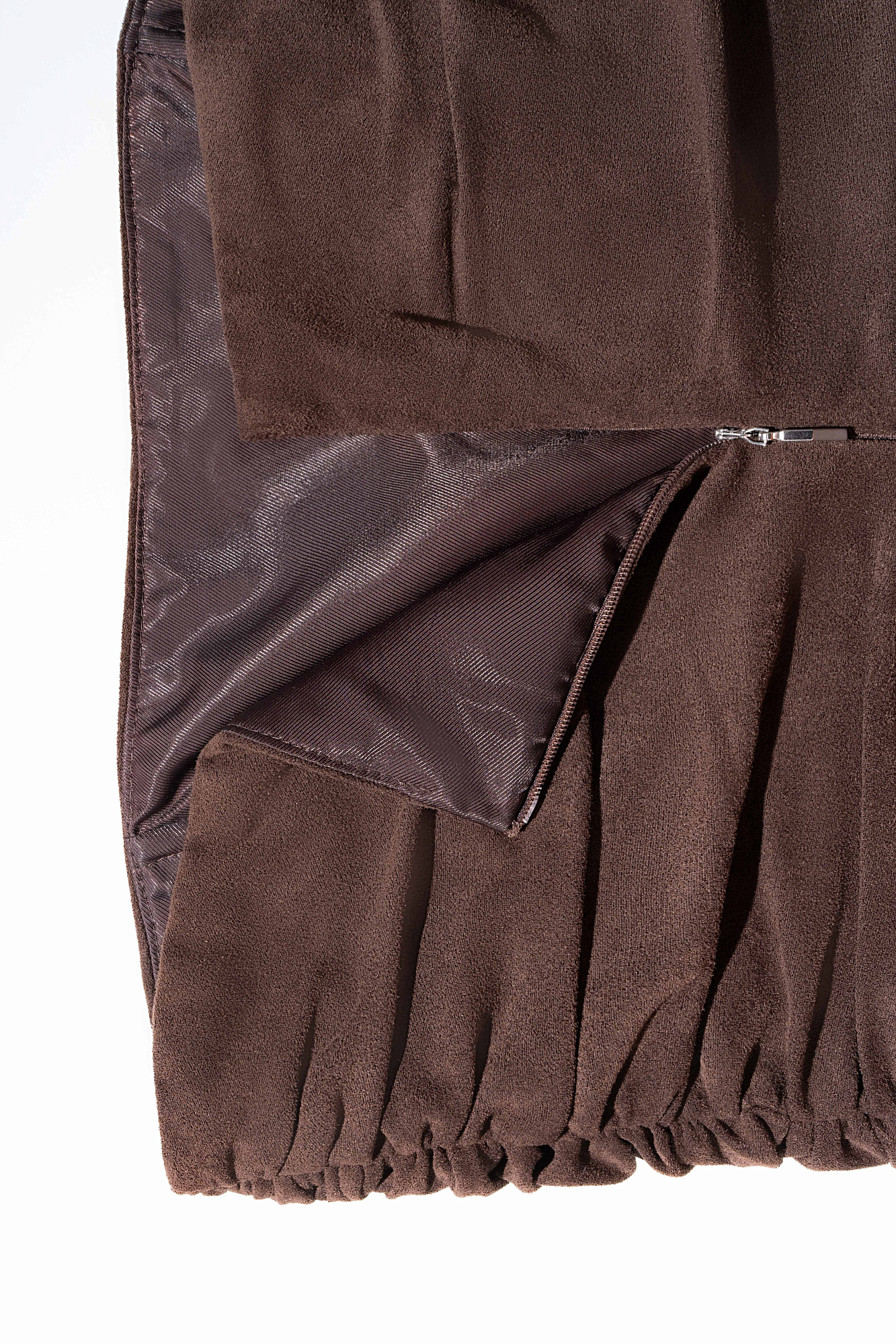 Корсет из ткани с имитацией внешнего вида и свойств натуральной замши. Модель приталенного силуэта, без бретелей, с баской и драпировкой. Застежка на молнию на спинке. Изделие на подкладке.