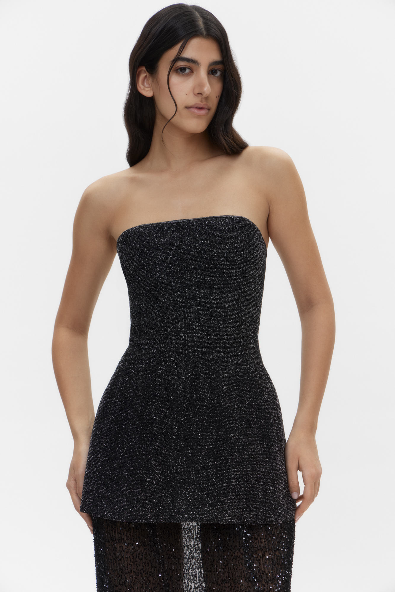 Трикотажный корсет из вискозы с люрексом. Модель удлиненного силуэта, на тонких бретельках. Бретельки отстегиваются. Застежка изделия на молнию на сзади.