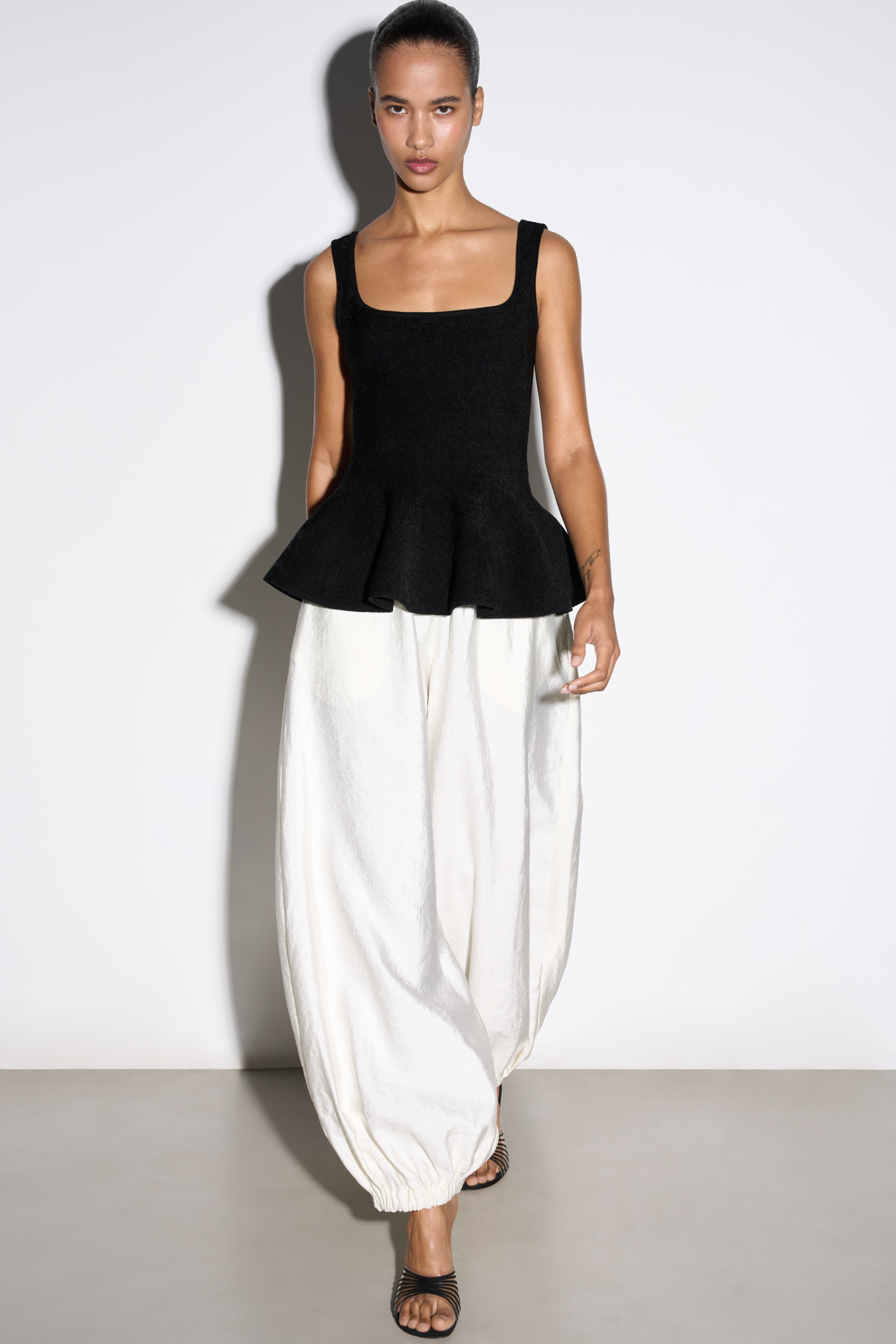 Трикотажный корсет из плотной вискозы. Модель на широких бретельках с баской. Застежка на молнию сзади. Изделие без подкладки.