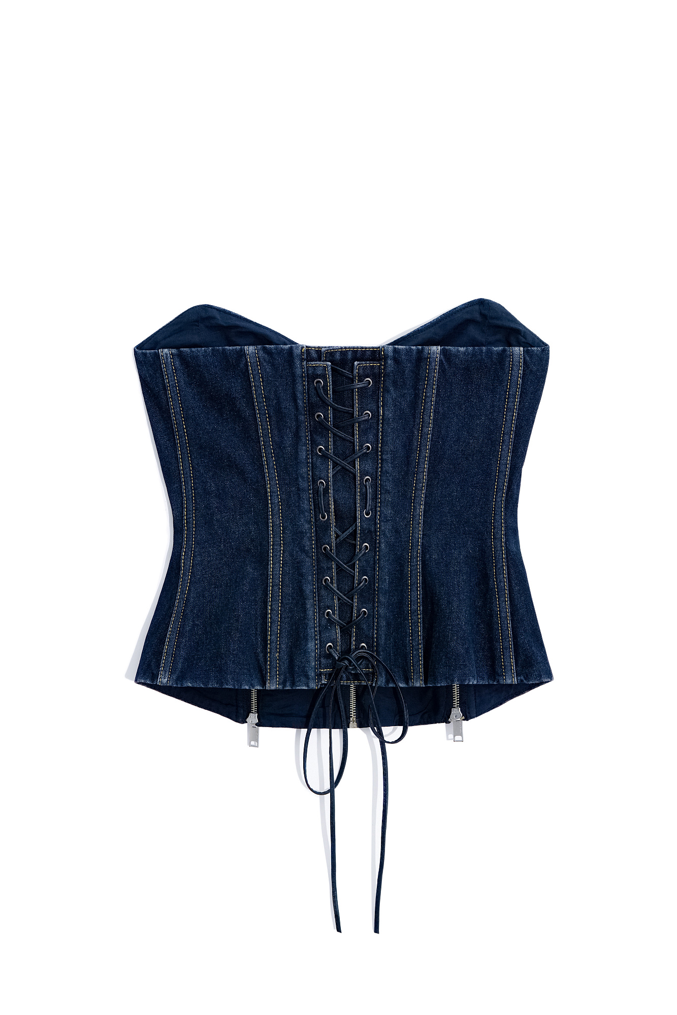 Джинсовый корсет из 100% хлопка. Модель приталенного силуэта с акцентрой строчкой и застежкой на молнию спереди. Шнуровка на спинке.