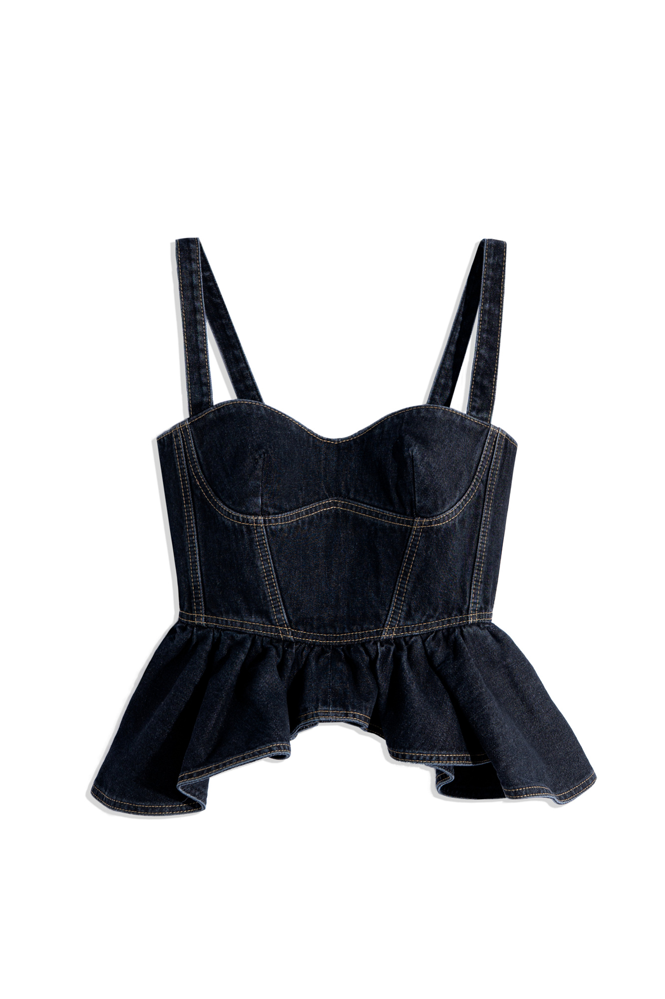 Джинсовый топ из 100% хлопка. Модель приталенного силуэта на широких бретельках, с фигурным лифом, акцентными строчками и баской. Застежка на молнию сзади.