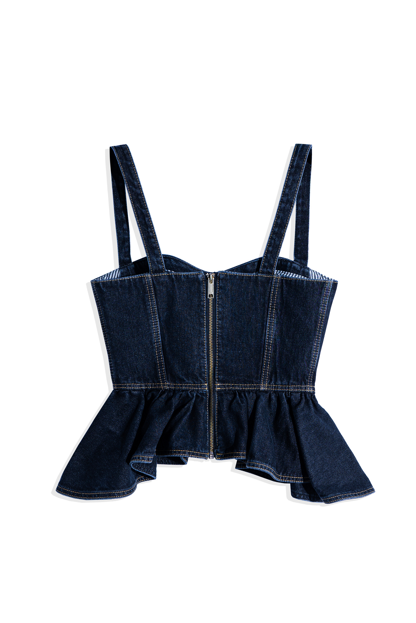 Джинсовый топ из 100% хлопка. Модель приталенного силуэта на широких бретельках, с фигурным лифом, акцентными строчками и баской. Застежка на молнию сзади.