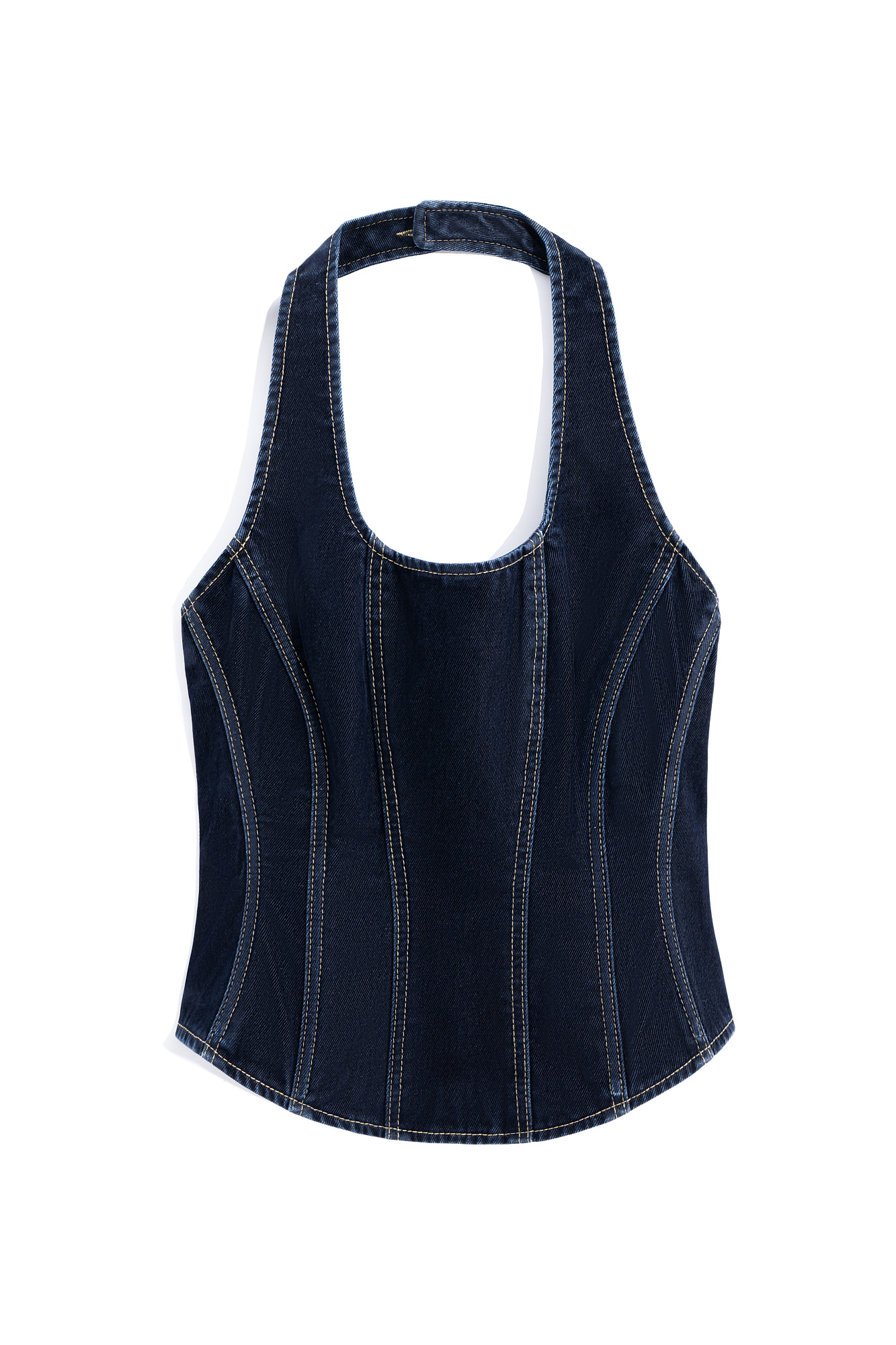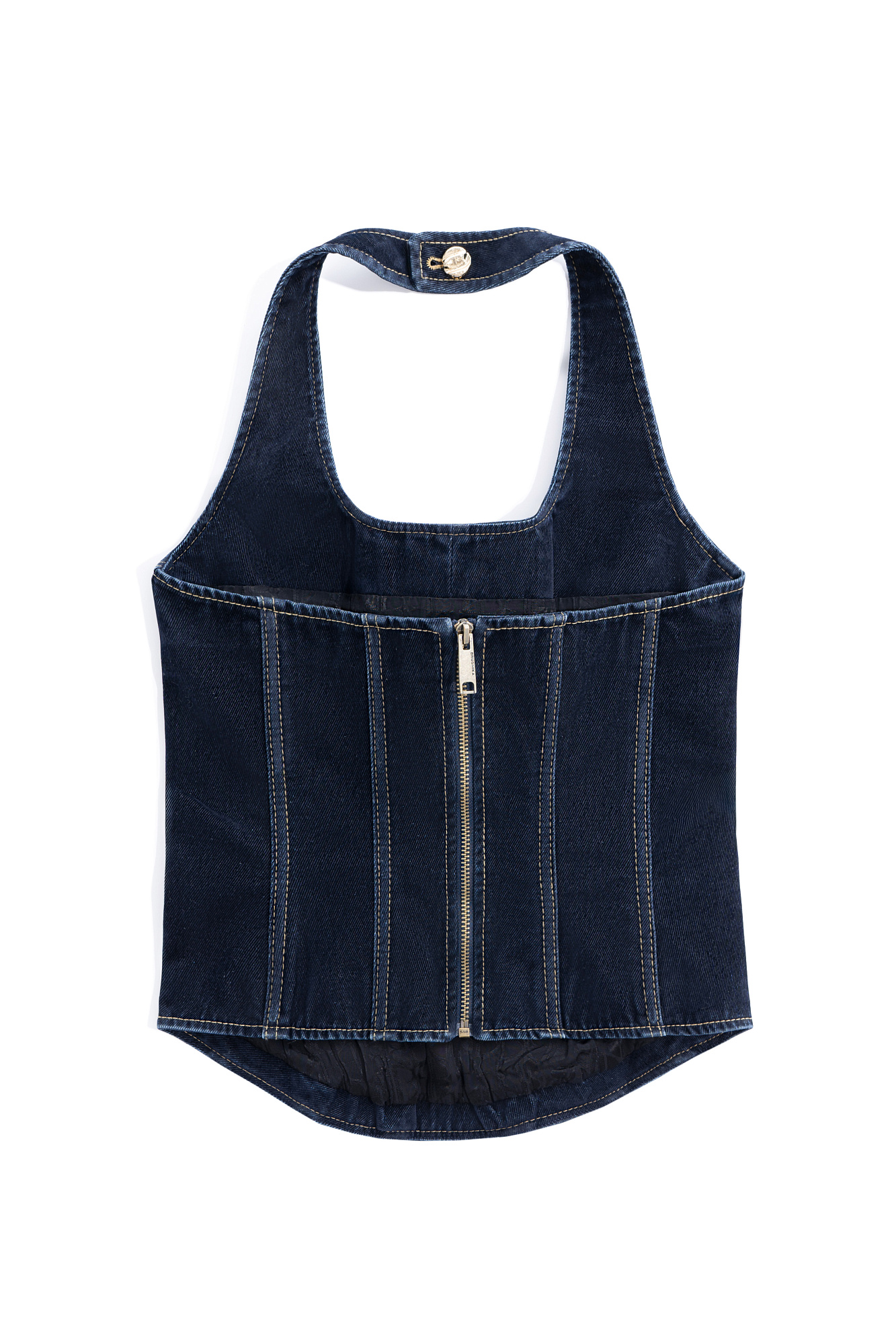Джинсовый корсет из флокированного денима - 100% хлопка с имитацией бархатной текстуры. Модель с акцентными строчками контрастного цвета, открытой спиной и вырезом халтер. Застежка на молнию по спинке и пуговицу на шее.