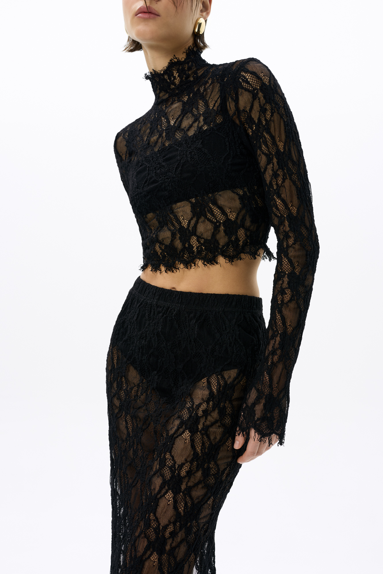 Укороченный топ с кружевом. Модель свободного силуэта с застежкой на молнию. Дополнить образ можно юбкой в таком же стиле.