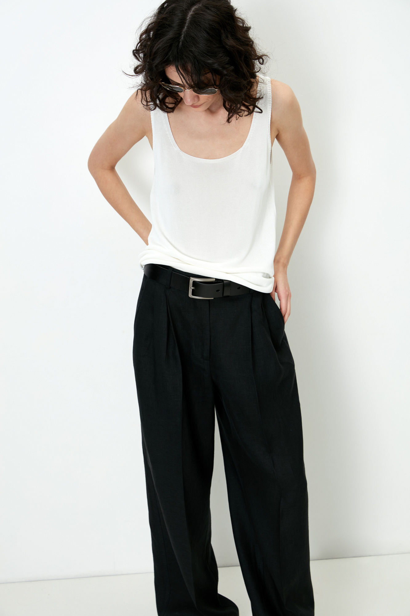 Цельновязаная майка из 100% вискозы на тонких бретелях.