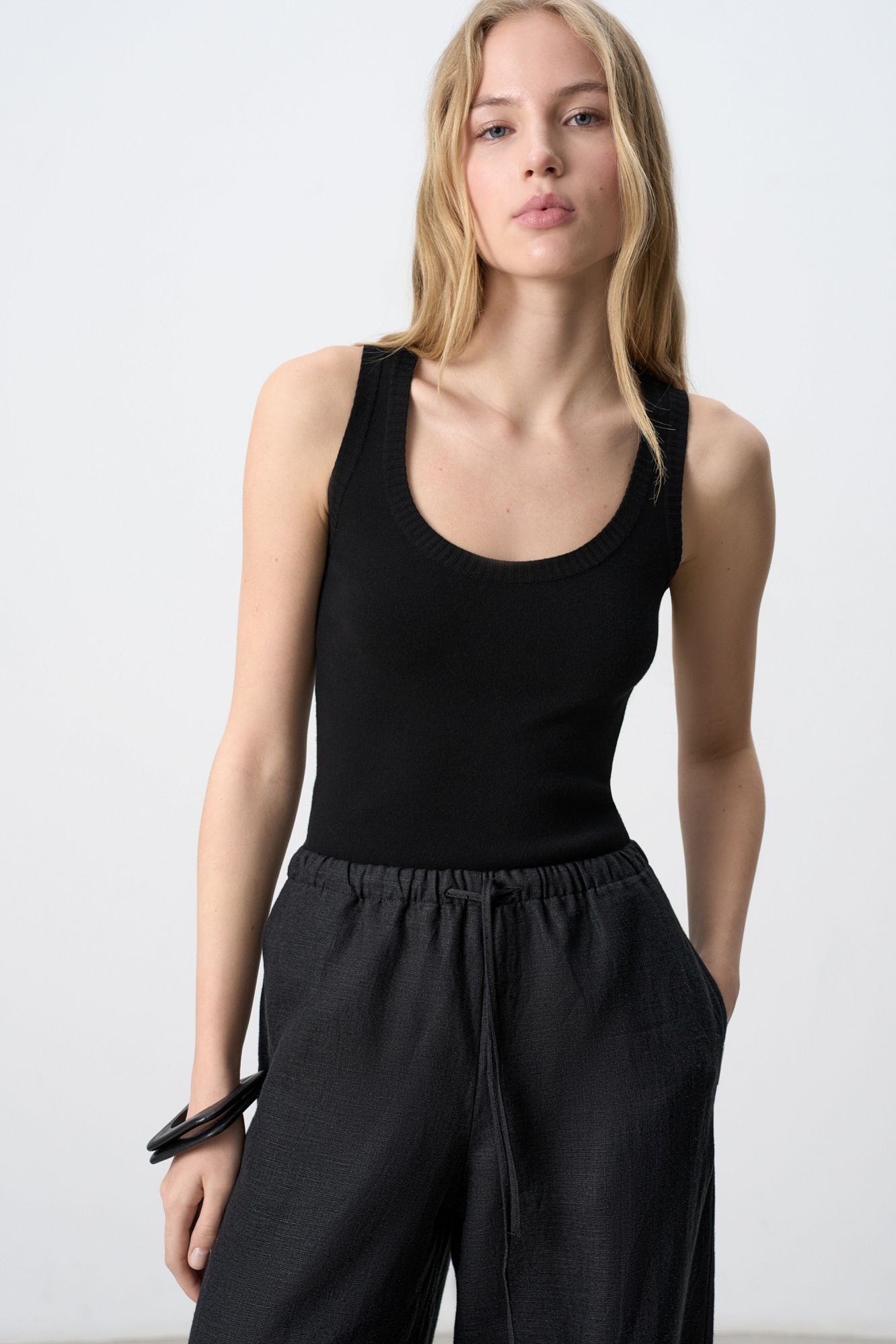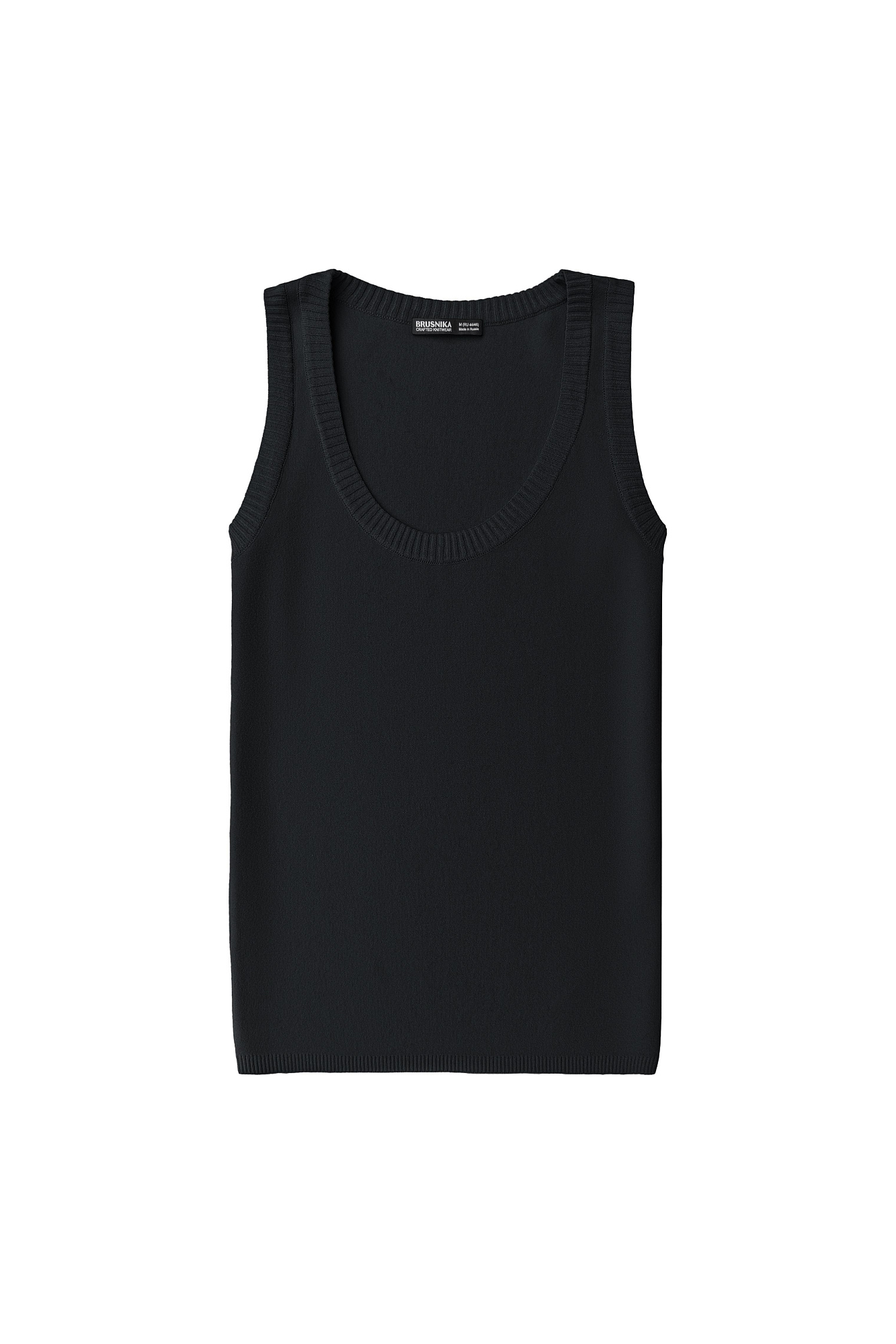 Удлиненная трикотажная майка из вискозы c круглым вырезом и открытыми плечами.