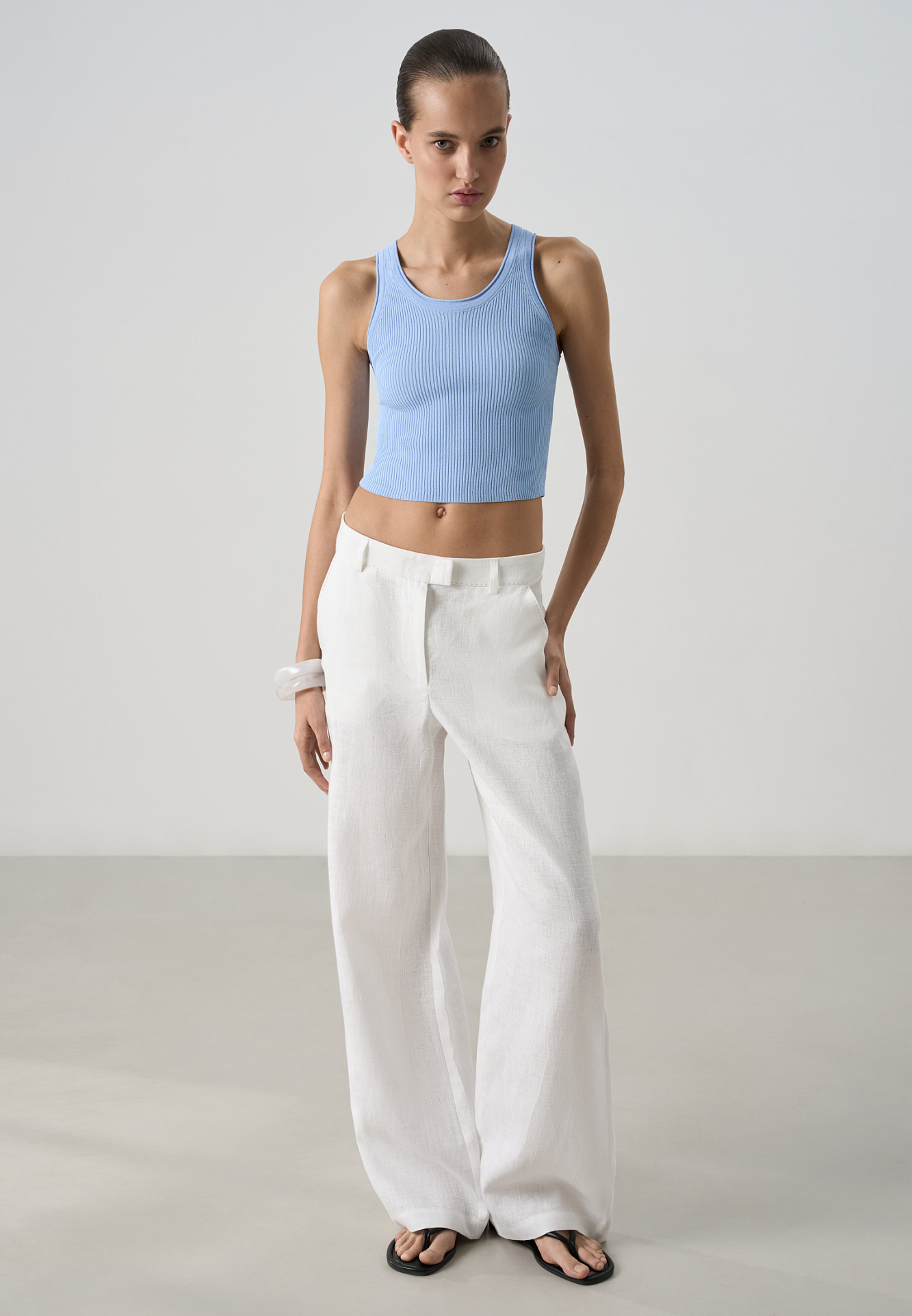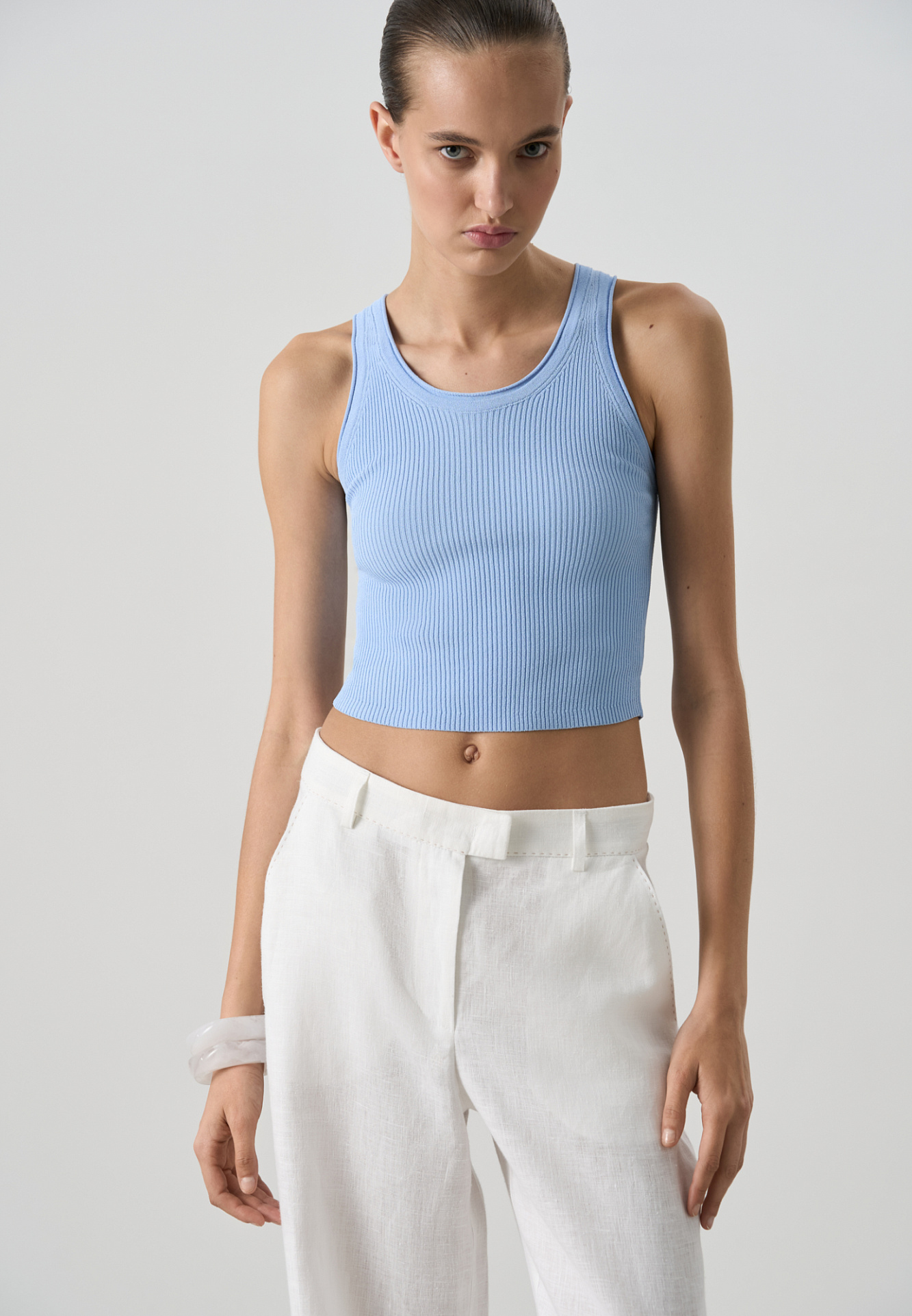 Трикотажная майка из вискозы в рубчик. Модель с глубокой проймой, арочным низом и U-образным вырезом горловины с валиком.