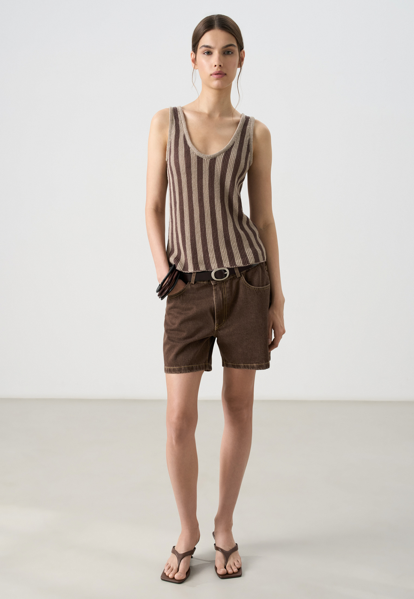 Трикотажная майка из 100% льна. Модель на широких бретелях, с глубокой проймой, U-образным вырезом горловины и валиком по низу. Изделие выполнено в вертикальную полоску.